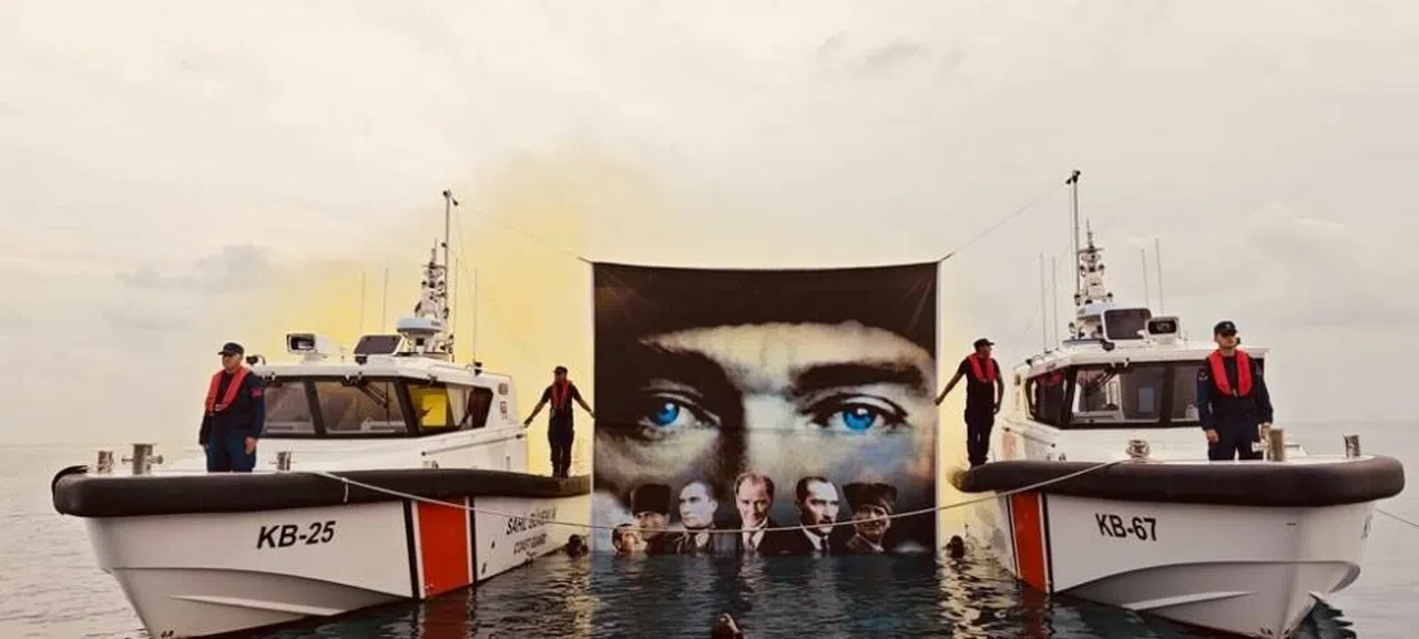 Dalgıçlar da denizin altında Atatürk posteri ve Türk bayrağı açarak siren seslerinin çalmasıyla birlikte saygı duruşunda bulundu.