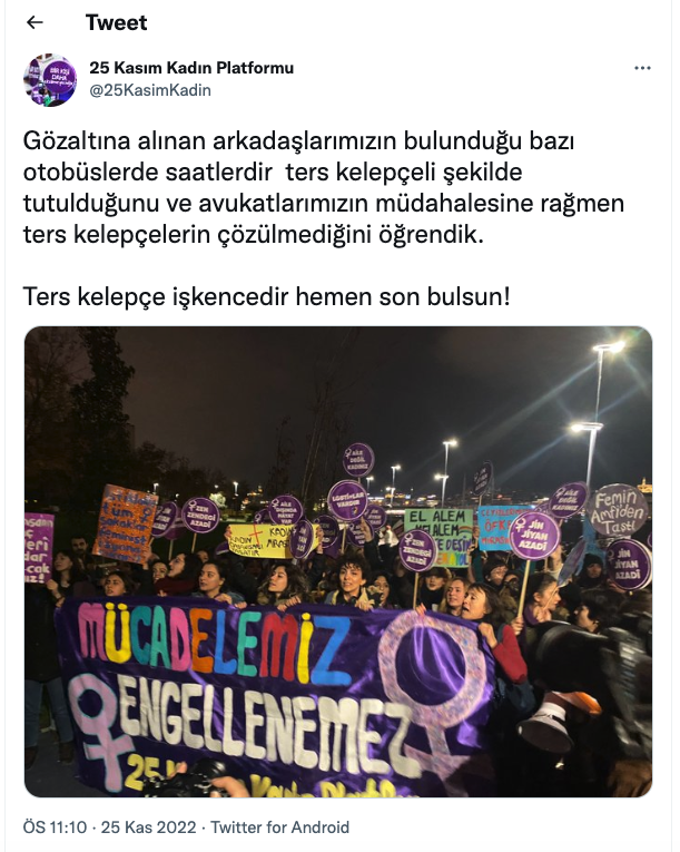25 Kasım Kadın Platformu ise twitter hesabından yaptığı açıklamada, "Gözaltına alınan arkadaşlarımızın bulunduğu bazı otobüslerde saatlerdir ters kelepçeli şekilde tutulduğunu ve avukatlarımızın müdahalesine rağmen ters kelepçelerin çözülmediğini öğrendik" açıklamasını yaptı.Platform başka bir paylaşımında, "Avukatlarımız içeri alınmıyor, gözaltına alınan arkadaşlarımızdan haber almakta zorlanıyoruz! Arkadaşlarımızın durumunu öğrenmek hakkımız, bu hukuksuzluk son bulsun!" dedi.