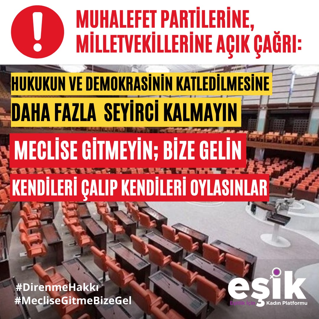 Eşitlik İçin Kadın Platformu (EŞİK), TBMM'de kabul edilmek üzere olan iki yeni yasa paketine karşı muhalefete açık bir çağrıda bulundu: “Hukukun ve demokrasinin katledilmesine seyirci kalmayın, Meclis’e gitmeyin, bize gelin.”