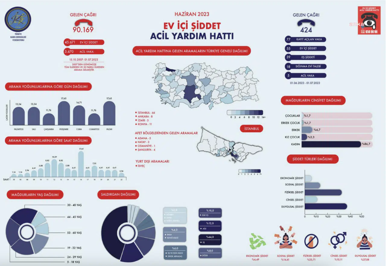 TKDF, Ev İçi Şiddet Acil Yardım Hattı Haziran 2023 Veri ve Analiz Raporu’nu bugün yayınladı. Rapora göre; federasyona haziran ayında 424 çağrı geldi. Bu çağrılardan 55’i ev içi şiddet, 39’u eş şiddeti, 18’i sığınma evi talebi, 5’i acil müdahale edilmesi gereken vaka ve 77’si açılan vaka olarak kayda geçti. Ev İçi Şiddet Acil Yardım Hattı’na, hizmete girdiği 15 Ekim 2007’den haziran ayına kadar gelen toplam çağrı sayısı ise 90 bin 169 oldu.