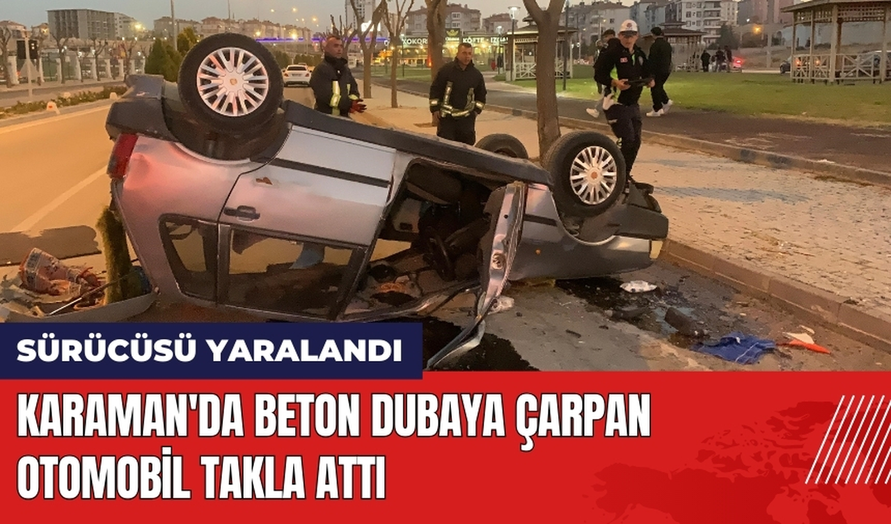 R.Ü. (77) yönetimindeki 42 ASU 539 plakalı otomobil, sürücüsünün direksiyon hakimiyetini kaybetmesi sonucu kavşaktaki beton dubaya çarpıp takla attı. Ters dönen aracın sürücüsü yaralandı.