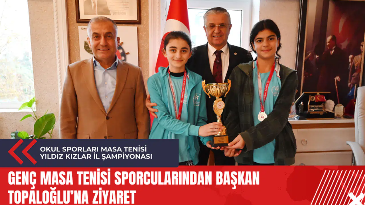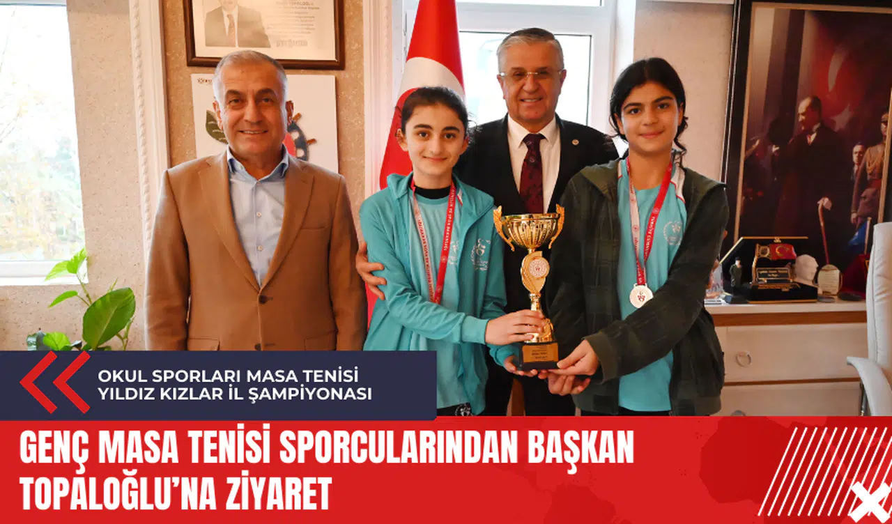 Genç masa tenisi sporcuları Aleyna Aslanoğlu ile Gülçiçek Selim ve okul müdürü Erol Öztürk, organizasyonda kazandıkları kupanın sevincini Başkan Topaloğlu ile paylaştı.