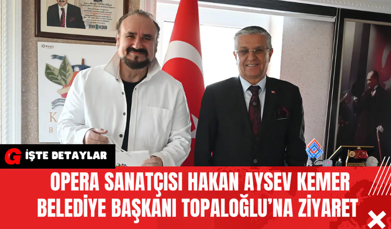 Türkiye’nin tanınmış opera sanatçılarından Hakan Aysev, Kemer Belediye Başkanı Necati Topaloğlu’nu makamında ziyaret etti. Bu ziyarette Aysev’e, Kemer Belediyesi Gençlik Orkestrası Şefi Furkan Üstündağ eşlik etti.