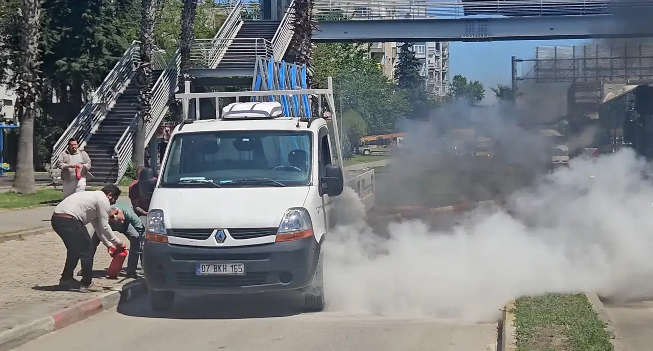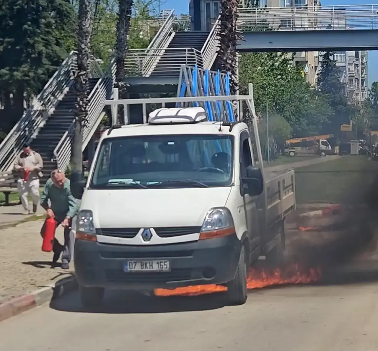 Seyir halinde olan 07 BKH 165 plakalı kamyonette benzin kaçağı nedeniyle alevler yükseldi. Sızan yakıtın etkisiyle alevler kısa sürede büyüyerek asfalta yayıldı. Kamyonetin altından yükselen dumanları fark eden sürücü aracı yol kenarına çekerek kendini dışarı attı.