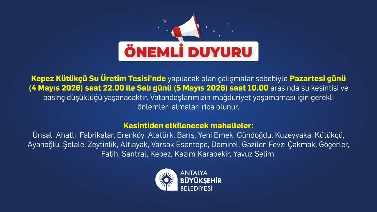 Antalya Büyükşehir Belediyesi tarafından paylaşılan resmi duyuruya göre, Kepez Kütükçü Su Üretim Tesisi bünyesinde gerçekleştirilecek olan kapsamlı bakım ve onarım çalışmaları nedeniyle su kesintisi yapılacak.