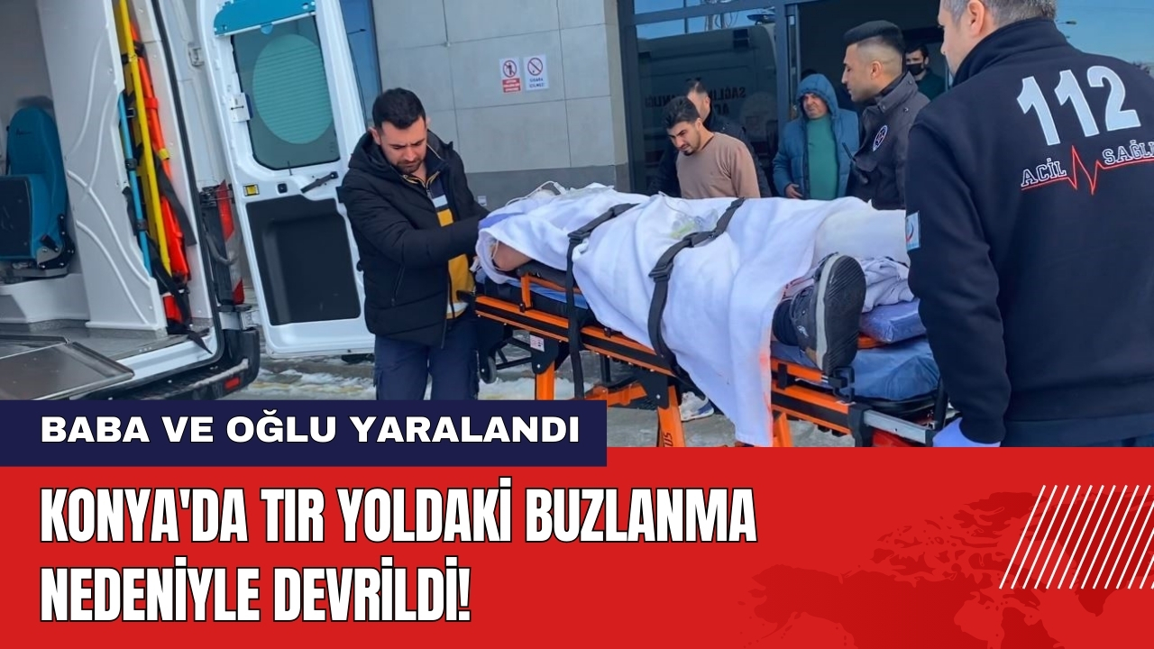 Konya'nın Kulu ilçesinde buzlanma nedeniyle kontrolden çıkan TIR devrildi, Sürücü baba ile oğlu yaralandı.