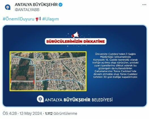 Antalya Büyükşehir Belediyesi'nin, sosyal medya üzerinden yaptıkları duyuruda, "Üniversite Caddesi'nden İl Sağlık Müdürlüğü istikametinde Konyaaltı 15. Cadde kontrollü olarak trafiğe açılmış olup sürücüler, yoldaki uyarı ișaretlerine dikkat ederek bu güzergahı da kullanabilirler. Çalışmalarımız Toros Caddesi'nde devam etmekte olup Toros Caddesi tahmini 30 gün trafiğe kapatılmıştır." ifadelerini kullandılar.