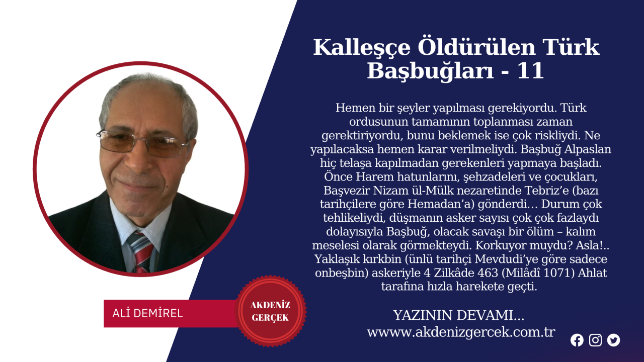 Hemen bir şeyler yapılması gerekiyordu. Türk ordusunun tamamının toplanması zaman gerektiriyordu, bunu beklemek ise çok riskliydi. Ne yapılacaksa hemen karar verilmeliydi. Başbuğ Alpaslan hiç telaşa kapılmadan gerekenleri yapmaya başladı. Önce Harem hatunlarını, şehzadeleri ve çocukları, Başvezir Nizam ül-Mülk nezaretinde Tebriz’e (bazı tarihçilere göre Hemadan’a) gönderdi… Durum çok tehlikeliydi, düşmanın asker sayısı çok çok fazlaydı dolayısıyla Başbuğ, olacak savaşı bir ölüm – kalım meselesi olarak görmekteydi. Korkuyor muydu? Asla!.. Yaklaşık kırkbin (ünlü tarihçi Mevdudi’ye göre sadece onbeşbin) askeriyle 4 Zilkâde 463 (Milâdî 1071) Ahlat tarafına hızla harekete geçti. Malazgirt Ovasına geldiğinde, düşmana iki fersah mesafede (yaklaşık 12 Km) ordugâhını kurdu. Töre gereği Kayser’e (Doğu Roma İmparator ünvanı) haber gönderip barış teklifinde bulundu. Doğu Roma İmparatorunun cevabı ve Türk Başbuğu’nun karşı cevabı herkesçe bilinmekte…