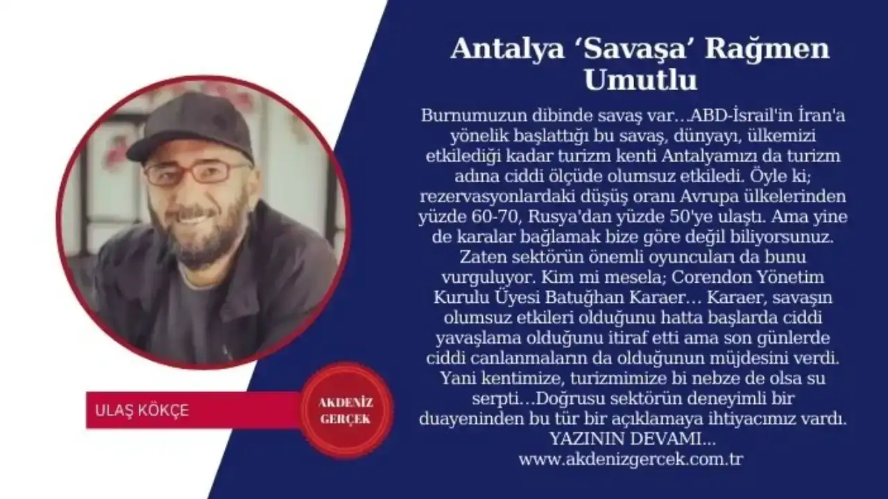 Burnumuzun dibinde savaş var…ABD-İsrail'in İran'a yönelik başlattığı bu savaş, dünyayı, ülkemizi etkilediği kadar turizm kenti Antalyamızı da turizm adına ciddi ölçüde olumsuz etkiledi. Öyle ki; rezervasyonlardaki düşüş oranı Avrupa ülkelerinden yüzde 60-70, Rusya'dan yüzde 50'ye ulaştı. Ama yine de karalar bağlamak bize göre değil biliyorsunuz. Zaten sektörün önemli oyuncuları da bunu vurguluyor. Kim mi mesela; Corendon Yönetim Kurulu Üyesi Batuğhan Karaer… Karaer, savaşın olumsuz etkileri olduğunu hatta başlarda ciddi yavaşlama olduğunu itiraf etti ama son günlerde ciddi canlanmaların da olduğunun müjdesini verdi. Yani kentimize, turizmimize bi nebze de olsa su serpti…Doğrusu sektörün deneyimli bir duayeninden bu tür bir açıklamaya ihtiyacımız vardı.
