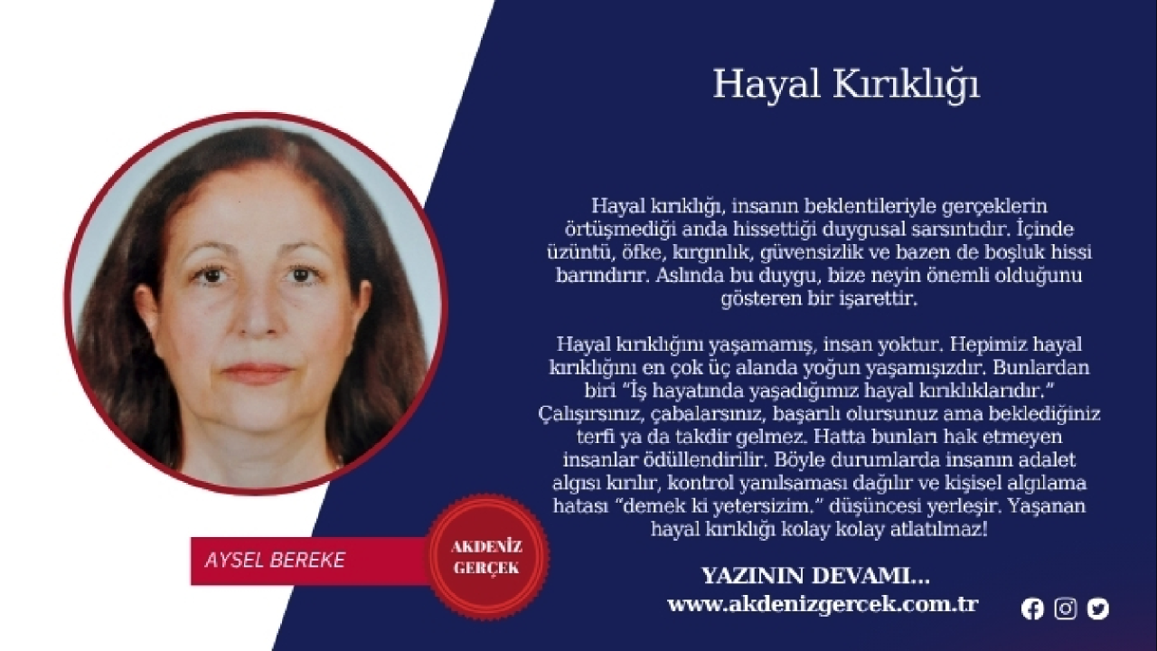 Hayal kırıklığı, kalbin gerçekle tanıştığı andır. Çünkü olmayan şeyler değil, “olmalıydı” dediğin şeyler acıtır. Ve insan en çok kendi kurduğu hayallere yenilir. Beklentiler büyüdükçe, sessiz vedalar çoğalır. Sevgi değil beklentidir insanı en çok yaralayan, kıran. Öte yandan iyi tarafından bakınca; kırıldığı yerden güçlenir insan. Hayal kırıklığı, gerçeğin seni eğitme şeklidir. Ders alırsın. Öğrenir ve temkinli olursun.