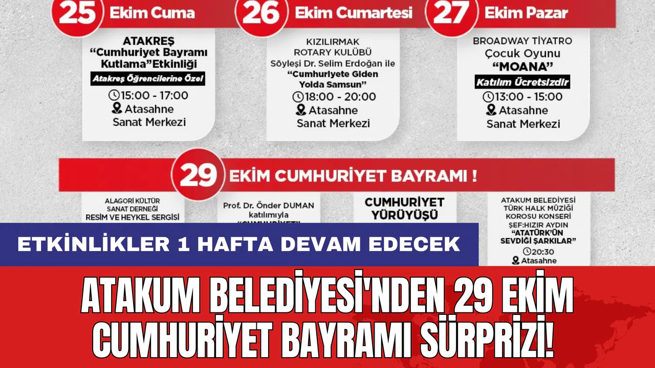 Cumhuriyet’in 101. yıl dönümünde Atakum Belediyesi hafta boyunca devam edecek olan etkinliklerle kutlayacak. Kutlama programı Ata Çocuk Çocuk Gelişim Merkezi’nin 25 Ekim Cuma günü Ata Sahne’de düzenleyeceği Cumhuriyet Bayramı etkinliği ile başlayacak.