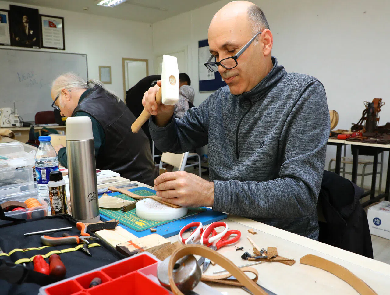 Boş zamanlarını değerlendirmek amacıyla kursa katıldığını eden ATASEM kursiyerlerinden Şenay Akdağ, “Deri sanatını yaşatmaya çalışıyoruz. Ham deri üzerine özel çivi uçlarıyla craft adı verilen malzemelerle döverek şekil veriyoruz. Hayal ettiğimiz motifleri ham deri üzerine işleyebiliyoruz. Çanta, kemer, bileklik gibi birçok şeyi yapmayı öğrendim. Atölyede arkadaşlarımızla birlikte keyif içinde çalışıyoruz” diye konuştu.
