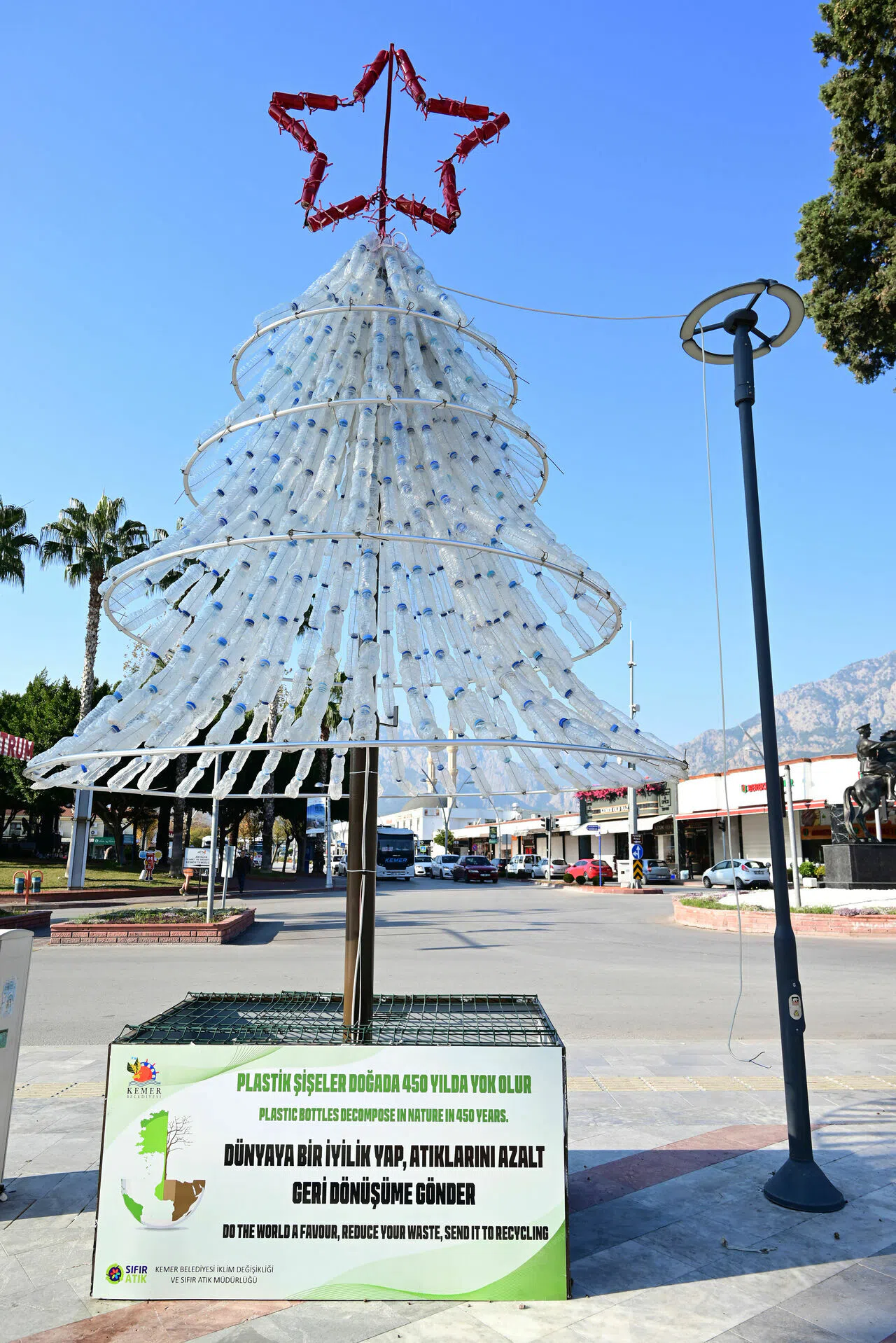 Daha önce Kollekt uygulamasıyla çöpleri bulunduğu yerden en kısa sürede temizleyen ve derelere yerleştirilen atık tutucu sistem ile denizlerin kirlenmesini engelleyen Kemer Belediyesi, farkındalık oluşturmak ve geri dönüşümü teşvik etmek amacıyla plastik ve metal atıklardan yılbaşı ağcı yaparak adından söz ettirmeye devam ediyor.