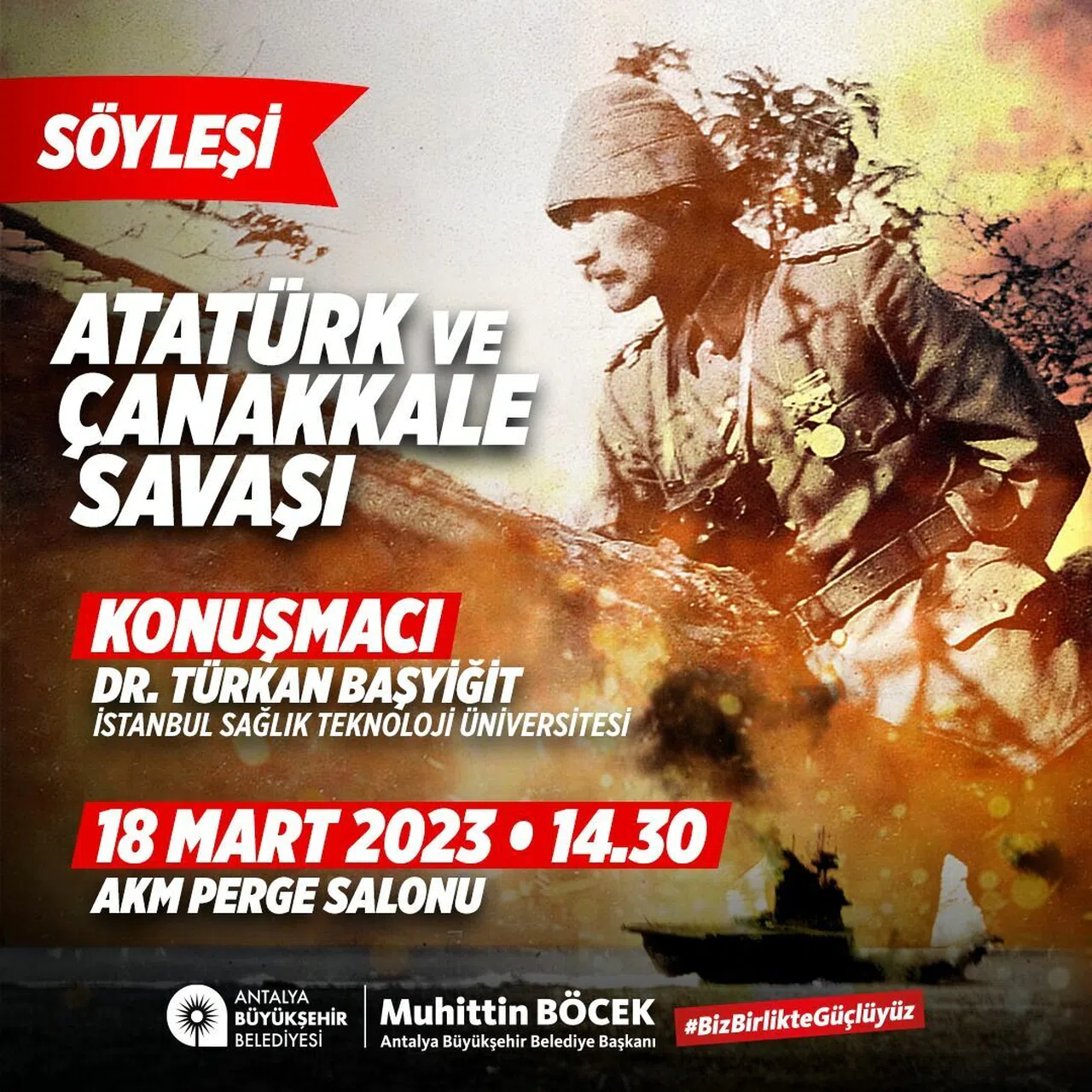 Antalya Büyükşehir Belediyesi Çanakkale Zaferi’nin yıldönümünü çeşitli etkinliklerle kutlayacak. Kent Tarihi ve Tanıtım Dairesi Başkanlığı tarafından 18 Mart Cumartesi günü “Atatürk ve Çanakkale Savaşı” konulu söyleşi düzenlenecek. Atatürk Kültür Merkezi (AKM) Perge Salonu’nda saat 14.30’da düzenlenecek söyleşide İstanbul Sağlık ve Teknoloji Üniversitesi Öğretim Üyesi Dr. Türkan Başyiğit konuşmacı olacak.