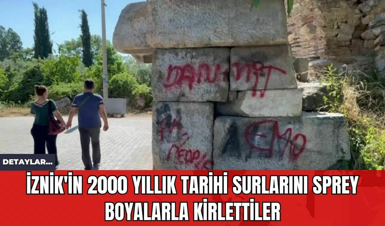 Dünyaca ünlü tarihi ilçe İznik'te, 2000 yıllık surlar yeniden sprey boyalarla kirletildi. Bizans, Roma, Osmanlı ve Selçuklu medeniyetlerine başkentlik yapmış olan Bursa'nın İznik ilçesinde, tarihi surlar geçmişte olduğu gibi yine vandalizme maruz kaldı.