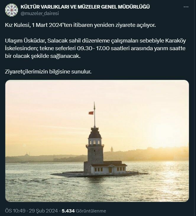 Kültür Varlıkları ve Müzeler Genel Müdürlüğü, İstanbul'un sembol yapılarından biri olan Kız Kulesi'nin uzun süren restore çalışmalarının tamamlandığını ve 1 Mart itibarıyla yeniden ziyarete açılacağını duyurdu.