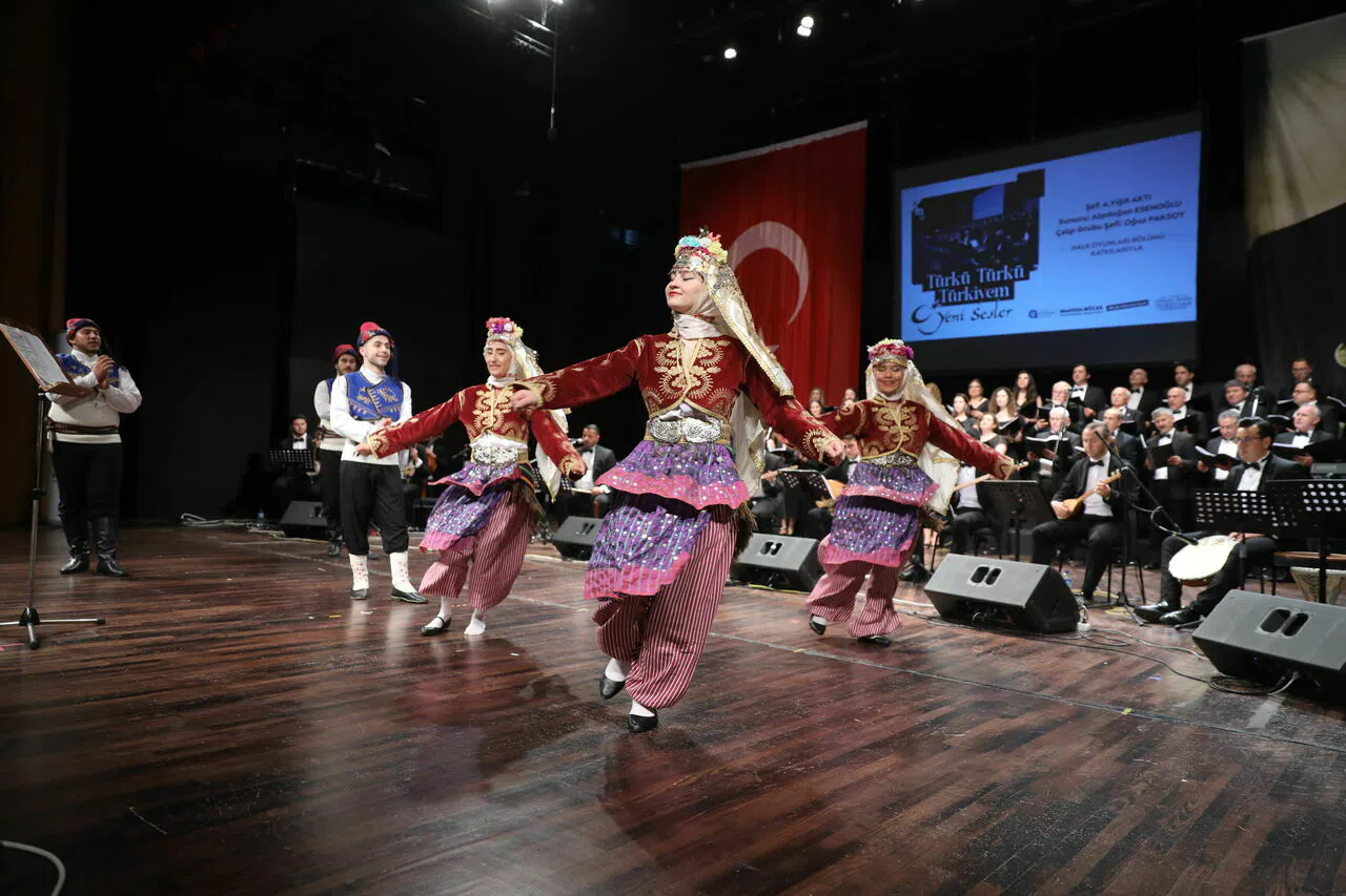 Atatürk Kültür Merkezi’nde düzenlenen konserde Şef Yiğit Aktı yönetiminde sahneye çıkan icra heyeti solo ve koro şakılar seslendirdi.
