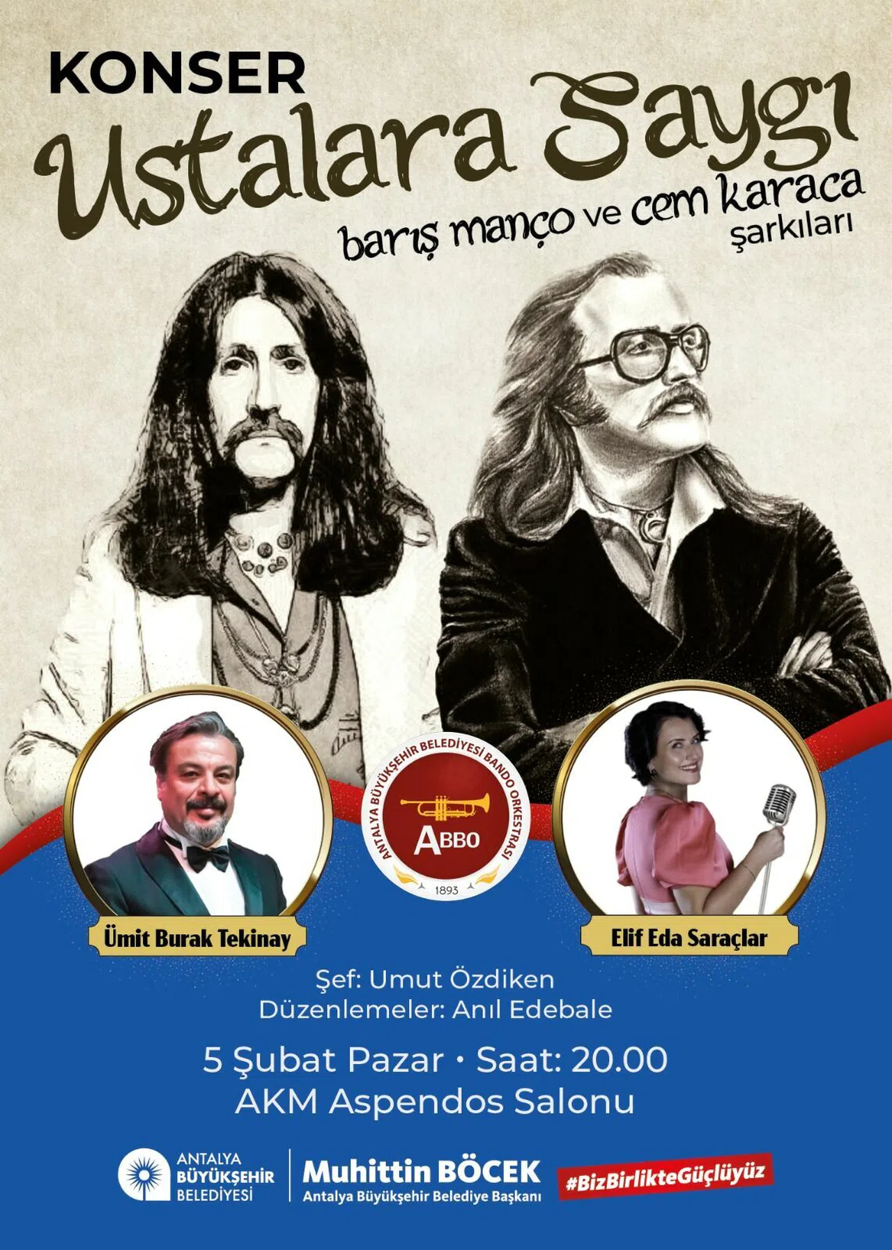 Bir döneme damgasını vuran usta sanatçılar Cem Karaca ve Barış Manço, unutulmaz şarkıları ile anılacak. 5 Şubat Pazar günü saat 20.00’de Atatürk Kültür Merkezi (AKM) Aspendos Salonunda düzenlenecek konser ücretsiz olacak. Kültür ve Sosyal İşler Dairesi Başkanlığı’na bağlı Büyükşehir Belediyesi Bando ve Orkestrası tarafından verilecek “Ustalara Saygı Barış Manço ve Cem Karaca Şarkıları” Konseri’ni Şef Umut Özdiken yönetecek. Anıl Edebale’nin düzenlemesi ve Ümit Burak Tekinay ve Elif Eda Saraçlar’ın yorumlarıyla en güzel Barış Manço ve Cem Karaca şarkıları Antalyalılar için seslendirilecek.