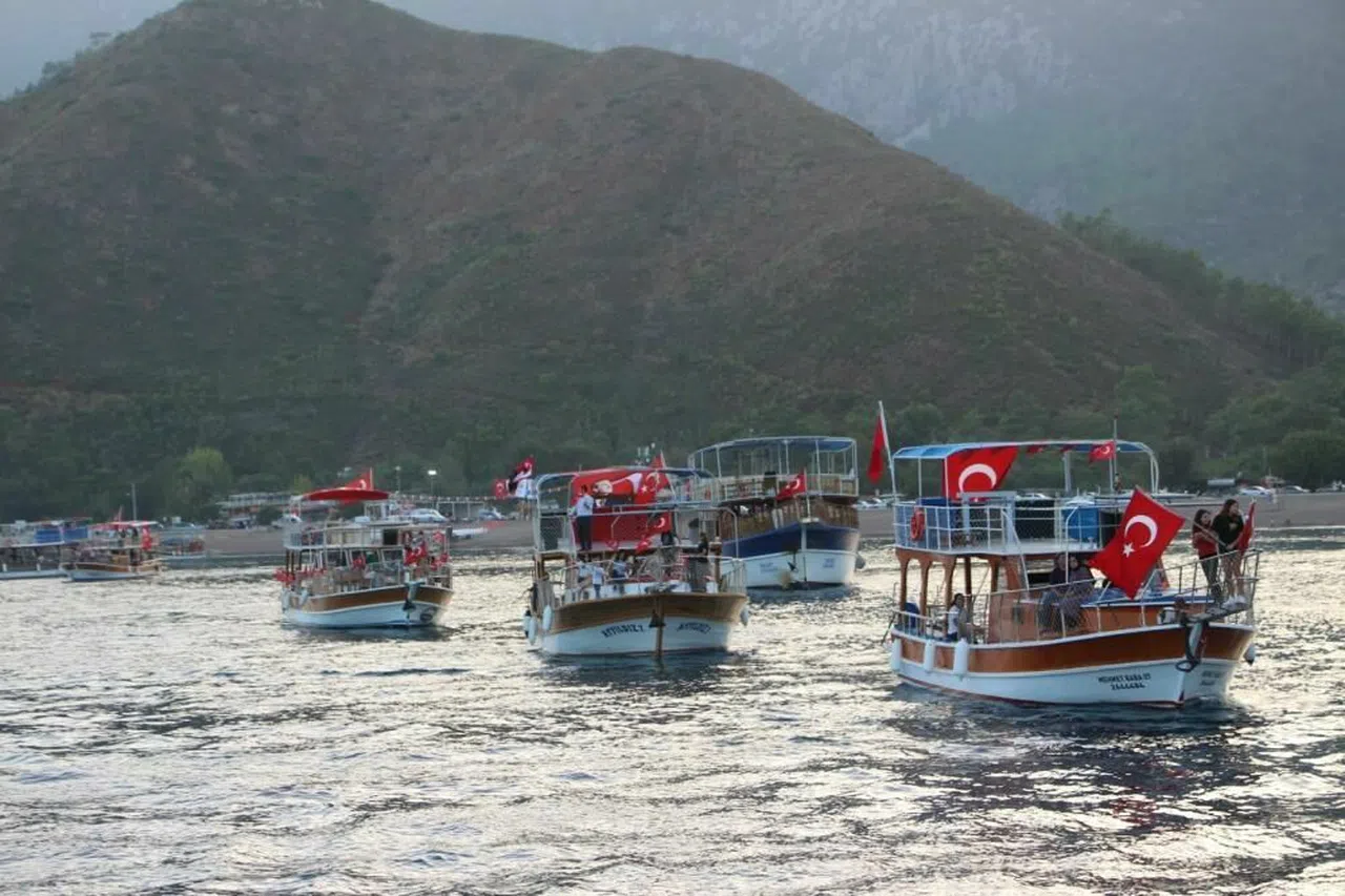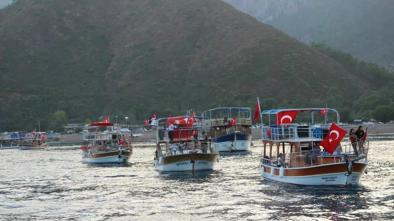 Yaklaşık 50 tur teknesinin katıldığı deniz turunda vatandaşlar, 10. Yıl Marşı ve İzmir Marşı eşliğinde ellerindeki bayrakları salladı.