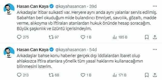 Konuyla ilgili sosyal medya hesabından açıklama yapan Hasan Can Kaya, tüm iddiaları reddederek şunları söyledi: "Arkadaşlar bahse konu haberler gerçek dışı iddialardan ibaret olup ahlaksızca iftira atanlara yönelik tüm yasal haklarımı kullanacağımın bilinmesini isterim."