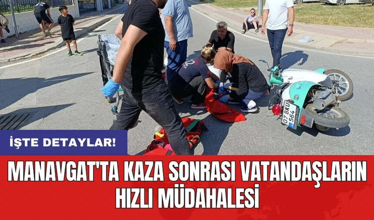 Kaza, Manavgat Örnek Mahallesi 1511 Sokakta meydana geldi. Alınan bilgiye göre, seyir halindeki Kamil Doğan'ın kullandığı 07 ATZ 695 plakalı otomobil ile Nurettin Köseoğlu'nun kullandığı 07 BKU 964 plakalı motosikletin kavşakta çarpıştı. Kazada yaralanan motosiklet sürücüsünün yardımına kazayı gören vatandaşlar koştu. Ayağını oynatamadığını söyleyen motosiklet sürücüsüne bir vatandaş getirdiği buz ile ilk müdahaleyi yaptı. Yaralı motosiklet sürücüsü 112 sağlık ekibinin olay yerindeki müdahalesinin ardından ambulans ile hastaneye kaldırıldı.
