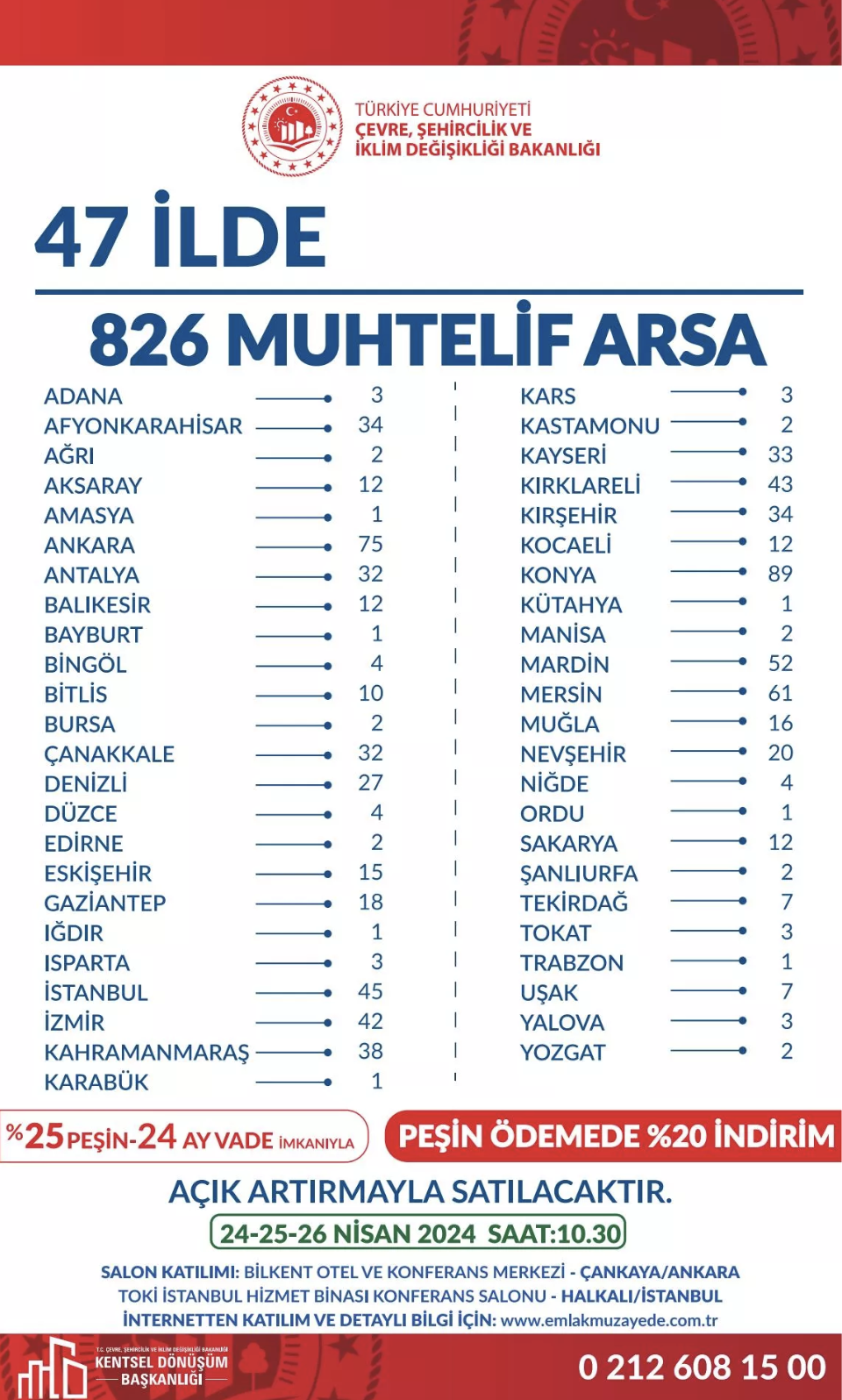 Çevre ve Şehircilik Bakanlığı, Kentsel Dönüşüm Başkanlığı aracılığıyla Türkiye genelinde 47 ilde toplamda 826 farklı arsanın açık artırmayla satışa çıkarılacağını duyurdu. Bu duyuru, mal sahibi olmak isteyenler için önemli bir fırsat sunuyor.