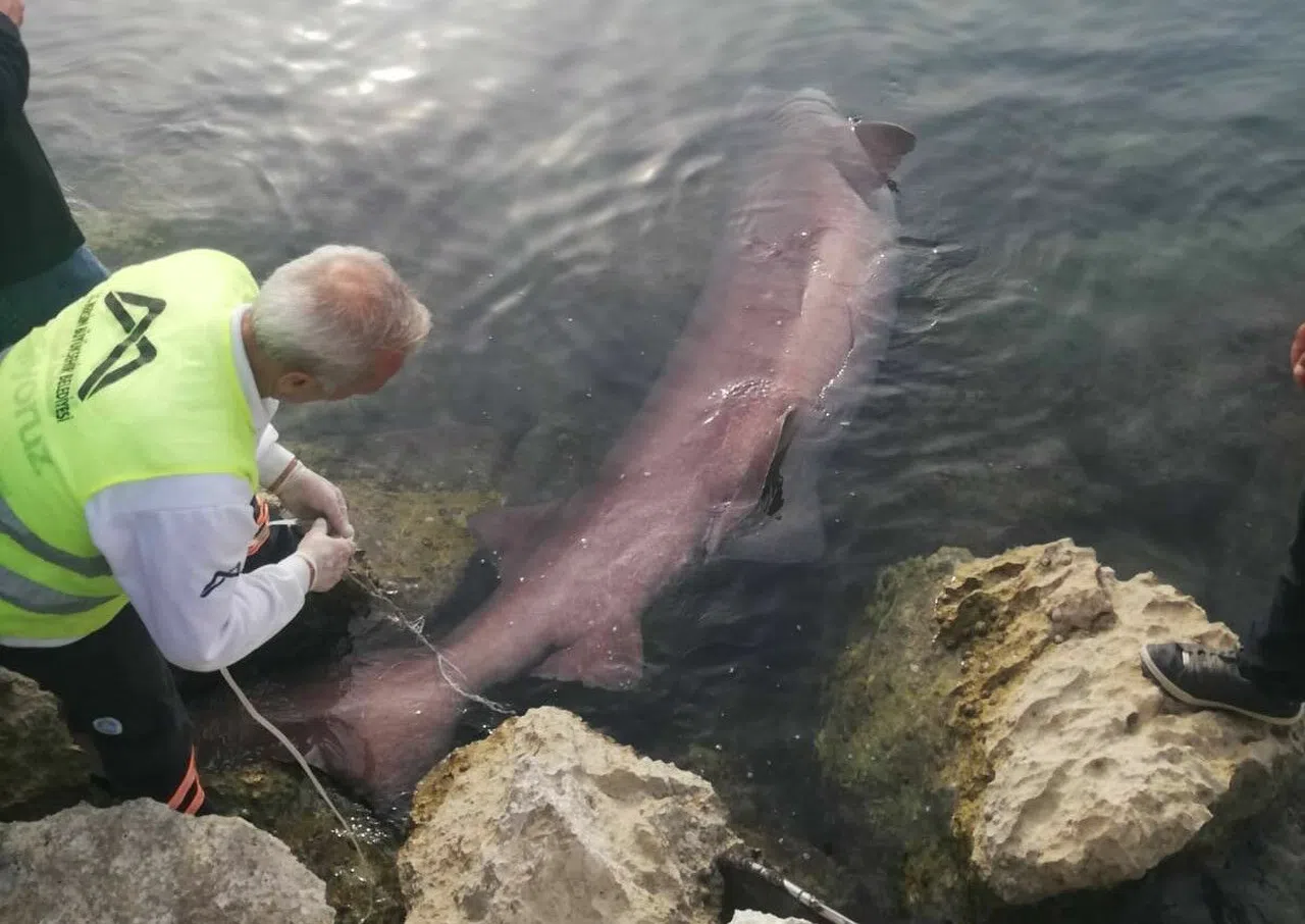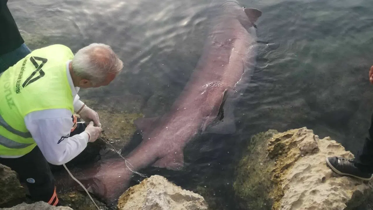 Köpek balığı vinç yardımı ile denizden çıkarılırken, gömüleceği bildirildi.