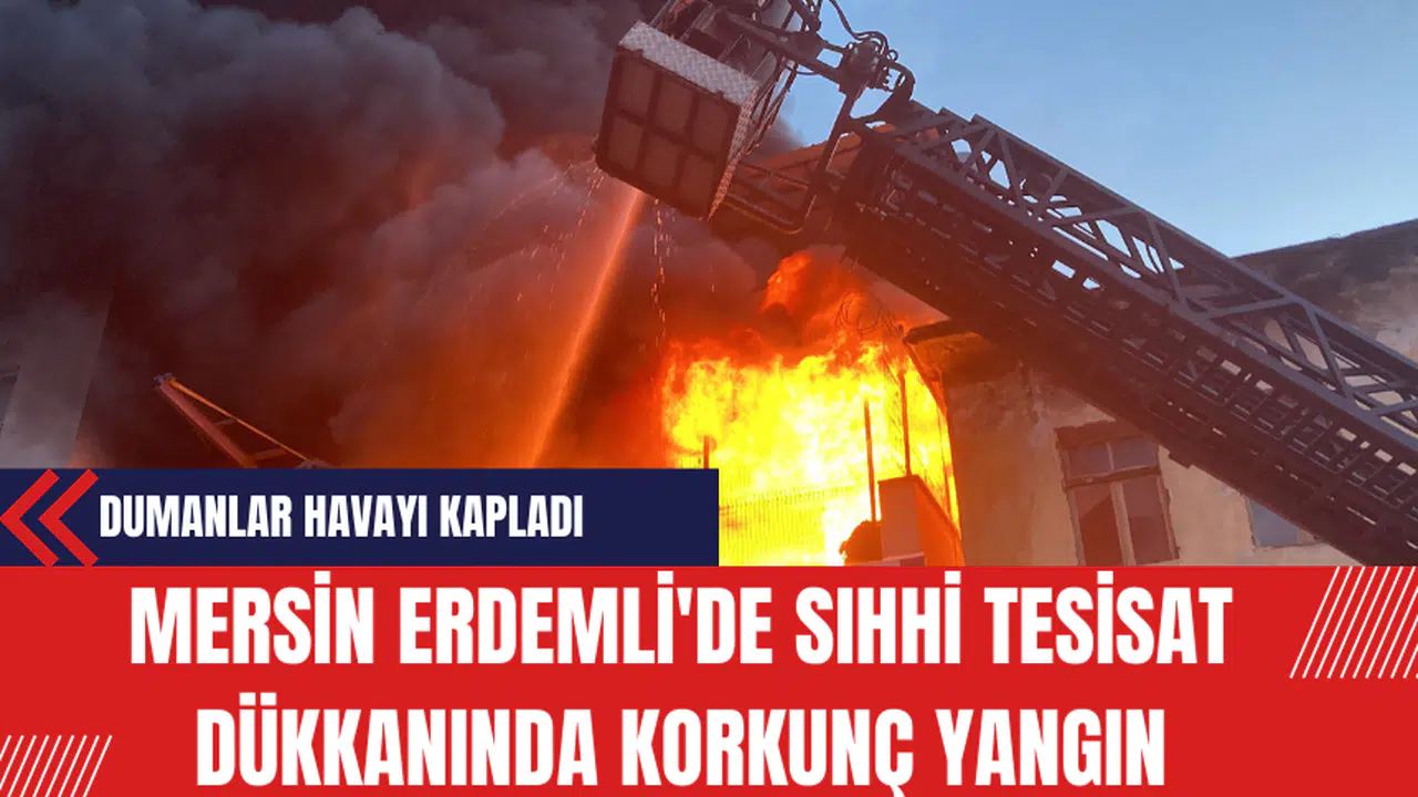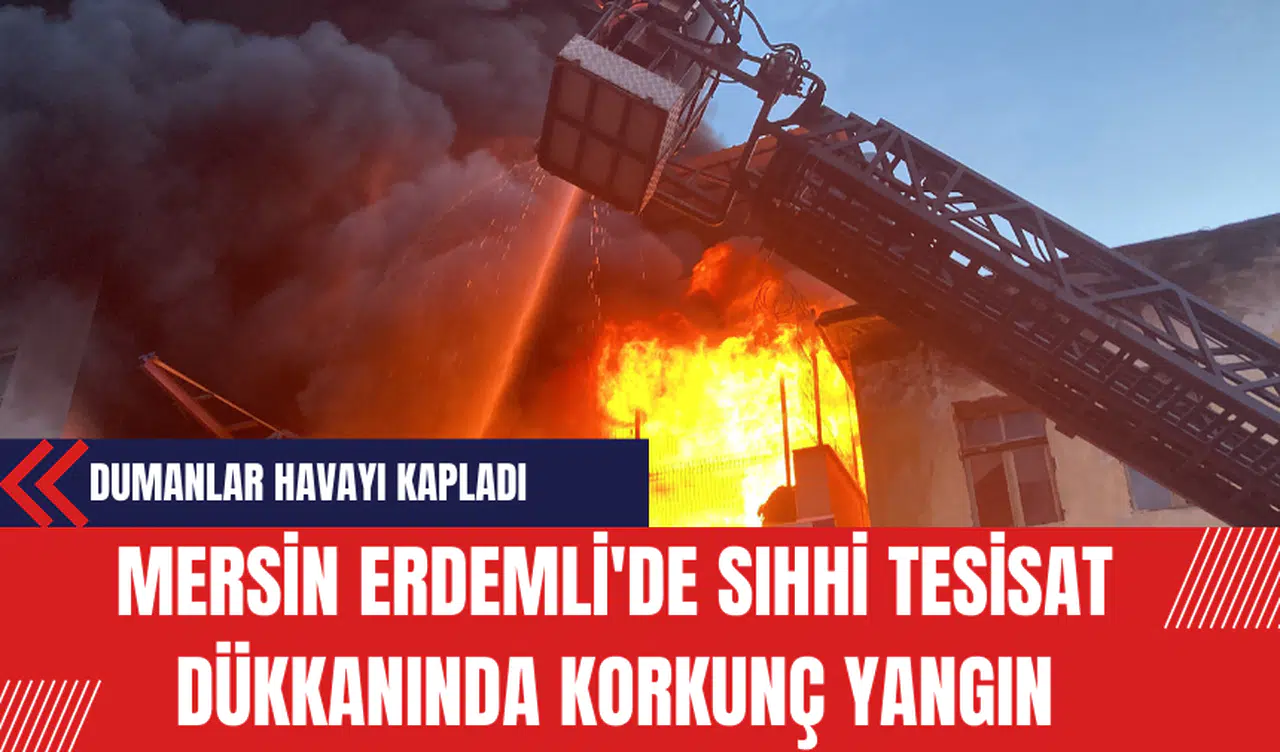 Mersin Erdemli'de bir sıhhi tesisat dükkanının depo kısmında başlayan yangın, şiddetli siyah dumanlarla gökyüzünü kapladı ve dışarı taşan alevleri itfaiye ekipleri zorlukla söndürdü.