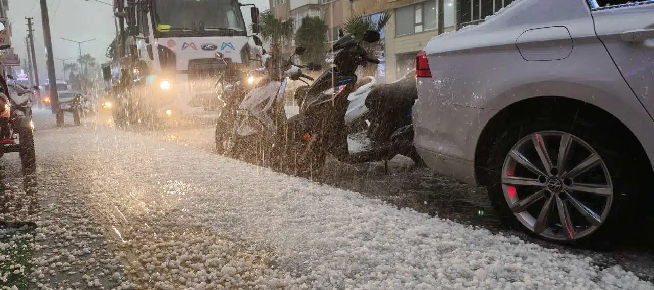 Mersin’in Silifke ilçesinde aniden bastıran şiddetli dolu yağışı hayatı felç etti. Yarım saat süren yağışın ardından cadde ve sokaklar kış ortasında kardan beyaza bürünürken, ekili arazilerde büyük hasar meydana geldi.