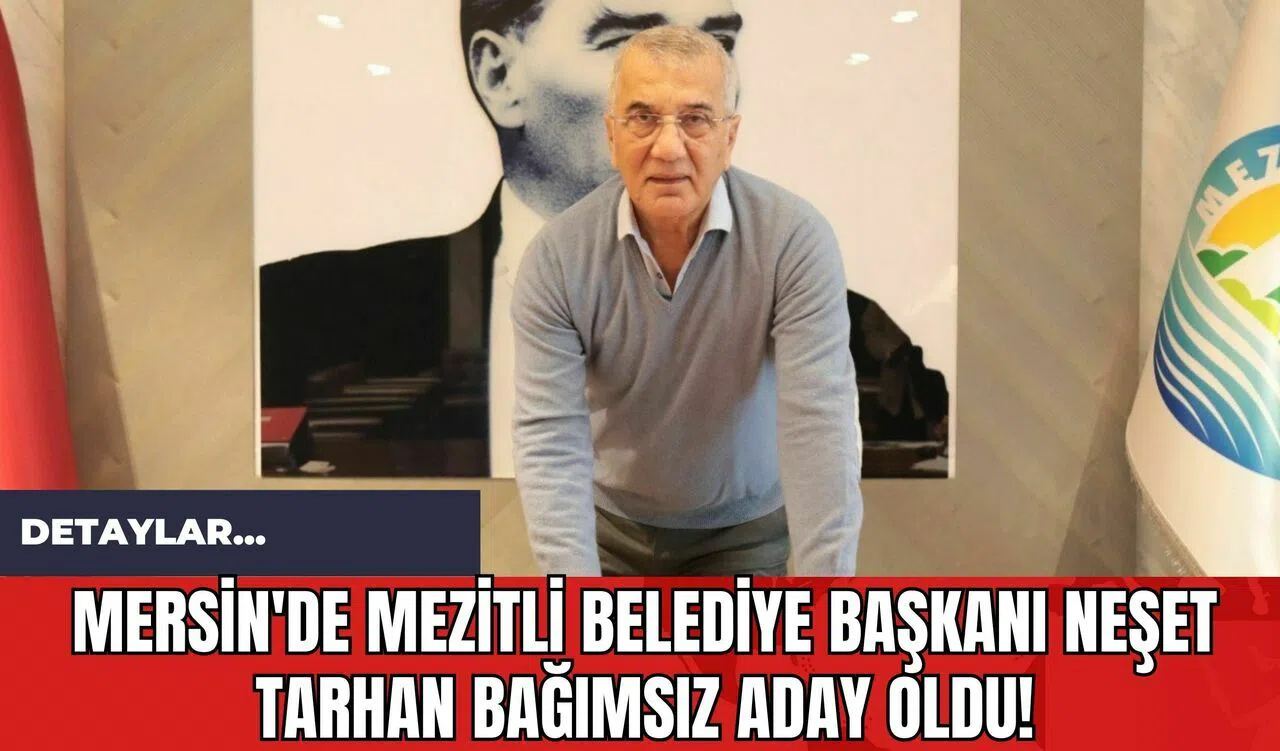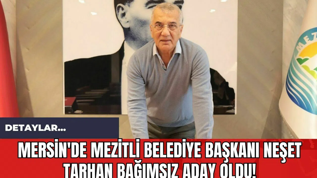 Mersin'in merkez Mezitli ilçesinde iki dönemdir belediye başkanlığı görevini yürüten Neşet Tarhan'ın bugün 'bağımsız adaylık' başvurusu yaptığı bildirildi. Tarhan'ın, Cumhuriyet Halk Partisi'nden aday gösterilmemesinin ardından bağımsız olarak seçimlere katılma kararı alması dikkat çekti.