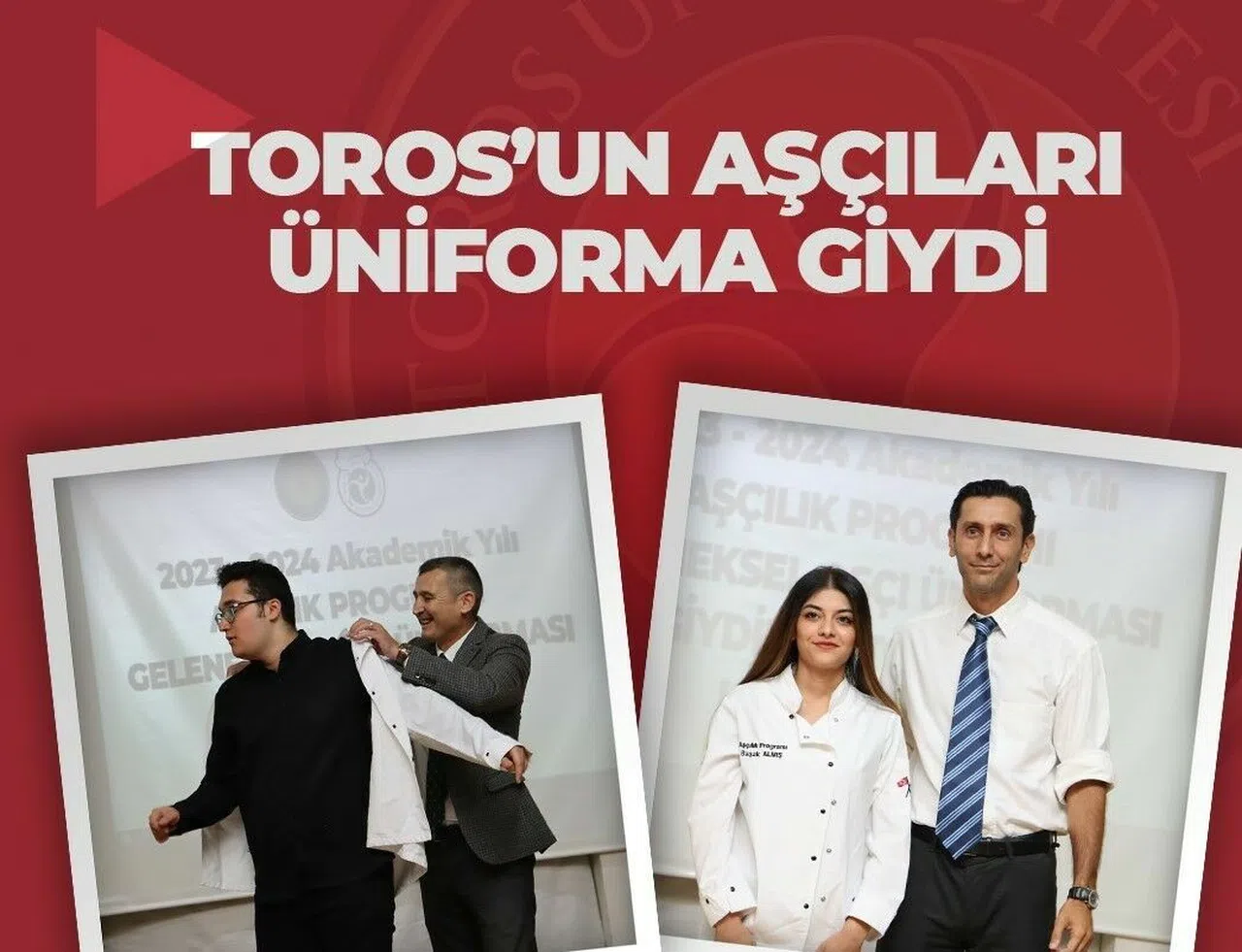 Toros Üniversitesi'nde, Meslek Yüksekokulu Aşçılık Programı Geleneksel Aşçı Üniforması Giydirme Töreni düzenlendi. 45 Evler Kampüsü konferans salonunda gerçekleşen törene, Toros Üniversitesi Rektörü Prof. Dr. Ömer Arıöz, Meslek Yüksekokulu Müdürü Öğr.Gör.Dr. Seçkin Doğan, Otel Lokanta İkram Hizmetleri Bölüm Başkanı Öğr. Gör. Kamuran Öztop, Aşçılık Bölümü Öğr.Gör. Uğurcan Metin, Öğr.Gör. Başak Öncel, Toros Üniversitesi Uygulama Hocası Ahmet Savaş, sektörün usta şefleri ve öğrenciler katıldı.