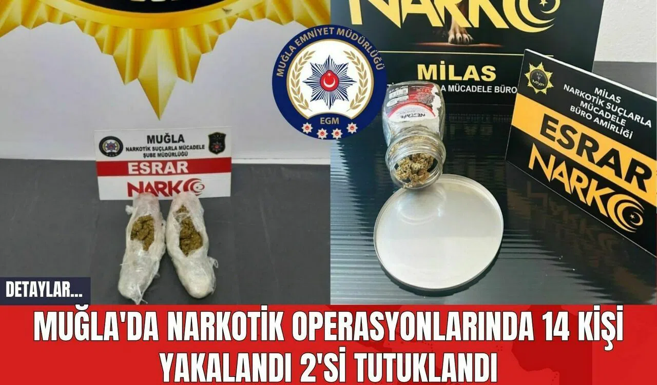 Muğla'da narkotik ekiplerinin gerçekleştirdiği 12 ayrı operasyonda 14 kişi yakalandı. Uy*şturucu madde ticareti suçlamasıyla gözaltına alınan 2 kişi tutuklanarak cezaevine gönderildi.