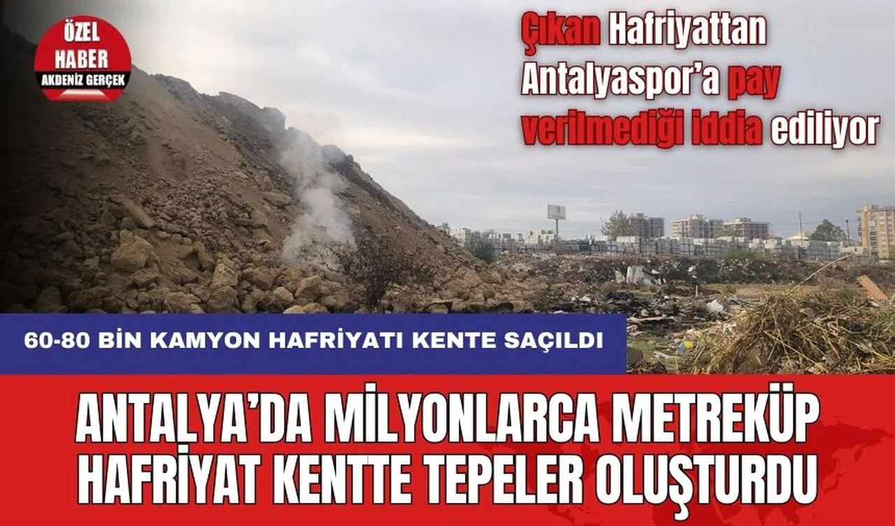 Antalya Büyükşehir Belediyesi geçmiş yıllarda onayladığı hafriyat gelirlerinin Antalyaspor’a verilmesi ile ilgili madde sebebiyle çıkan hafriyat bedelinin Antalyaspor’a ödenmediği iddia edildi. Edinilen bilgiye göre 100 milyon TL gibi bir rakamın Antalyaspor’a ödenmesi gerektiği ama ödenmediği belirtildi. 60-80 bin kamyon hafriyatın bedelinin tam rakamının ne kadar olduğu bilinmezken kamuoyu konuyla ilgili açıklama bekliyor. Hafriyat kontrolünün belediye ve Antalyaspor temsilcisinin bulunduğu bir ekibin yaptığı bilinirken 60-80 bin kamyon hafriyatına yönelik bir çalışma yapılıp yapılmadığı bilinmiyor.