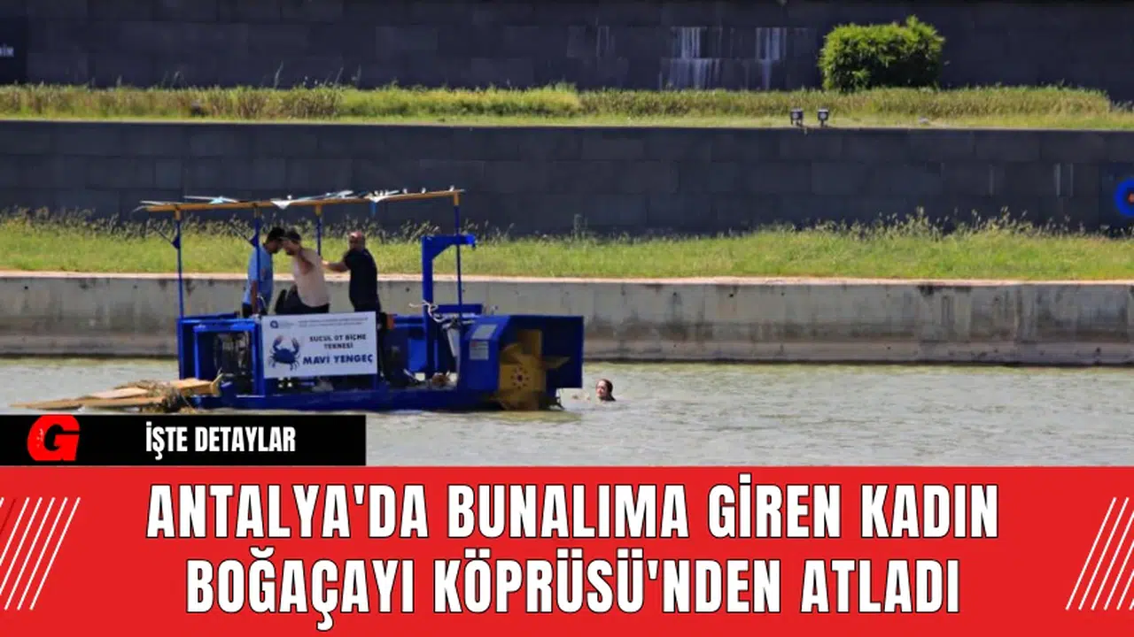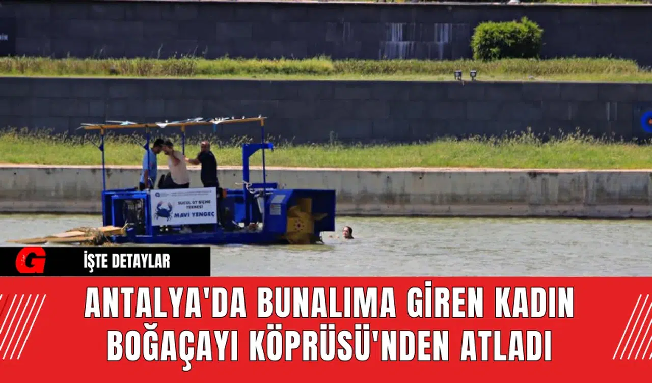 Antalya'nın Konyaaltı ilçesinde bunalıma giren ve intihar girişiminde bulunan Azerbaycan uyruklu Kabatur B., Boğaçayı Köprüsü'nden akarsuya atladı. Eşinden ayrılma aşamasında olan kadın, su yüzeyinde kurtarılmak istemediğini belirterek ekiplerden kaçtı. Uzun süren uğraşlar sonucunda Antalya Büyükşehir Belediyesi'ne ait "Mavi Yengeç" adlı atık toplama deniz aracıyla kurtarıldı.