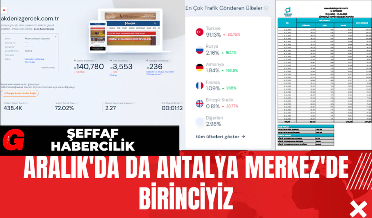 Google verilerine göre, Aralık Ayı’nda Akdeniz Gerçek Haber Sitesi'ne olan doğrudan tekil ziyaretçi sayısı 953 bin 473 kişi iken, toplam tekil ziyaretçi sayısı ise 1 milyon 461 bin 786 kişi olarak kaydedilmiştir. Sayfa gösterimi ise 3 milyon 404 bin 184 olarak hesaplanmıştır. Akdeniz Gerçek Haber Sitesi'nin bu başarıları, sadece yerel değil, ulusal düzeyde de dikkat çekmektedir. Haber sitesi, güçlü içeriği ve geniş kitlelere ulaşma başarısıyla önemli bir medya aktörü olarak kendini kanıtladı. Basın İlan Kurumu ölçümleme sistemi BİK Analitik’in gazetemize gönderdiği verilere göre Aralık Ayı’nın aylık ortalamasında günlük 3 bin olması gereken doğrudan tekil ziyaretçi olarak 4bin 4, günlük 20 bin olması gereken toplam tekil ziyaretçi 40 bin 402, günlük 60 bin olması gereken sayfa gösterimi 86 bin 705, 1 dakika olması gereken sayfada kalma süresi ise 1 dakika 6,5 saniye olarak bildirildi.