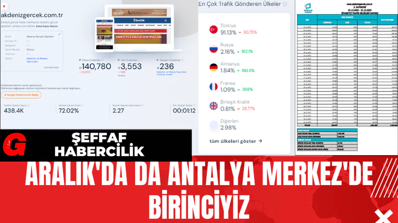 Antalya'nın Konyaaltı, Kepez ve Muratpaşa yani 3 merkez ilçesinde faaliyet gösteren haber siteleri arasında, 'Similarweb' sitesine göre ön plana çıkan Akdeniz Gerçek Haber Sitesi, birinci sırada yer almakta. Akdeniz Gerçek Haber Sitesi'nin kendi algoritmasına göre tıklanma sayıları ve ülke bazında trafik oranlarına ışık tutan 'Similarweb' verilerine göre, 438,4 bin tıklama aldığı ve okuyucularının yüzde 91'i Türkiye'den geldiği görülmektedir. BİK'in Antalya'daki haber siteleri için belirlediği toplam tekil ziyaretçi sayısı 20 bin, sayfa gösterim sayısı 60 bin ve ortalama sayfada kalma süresi 1 dakika olarak öne çıkmaktadır. Ancak, son aylarda Akdeniz Gerçek Haber Sitesi bu kriterlere göre performansı, kriterlerin üstüne çıkarak ön plana çıktı. Google verilerine göre, Akdeniz Gerçek Haber Sitesi'nin elde ettiği etkileyici başarılar da dikkat çekici hale geldi. Akdeniz Gerçek’in internet sitesi, Aralık ayında 3 milyon 404 bin 184 tıklama alarak geniş okuyucu kitlesini büyüttü.