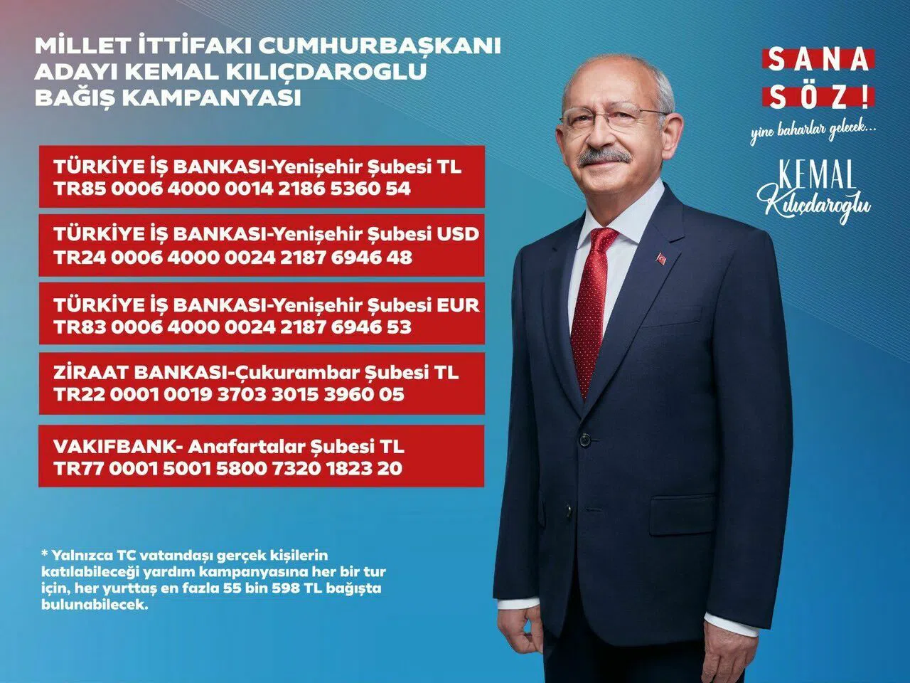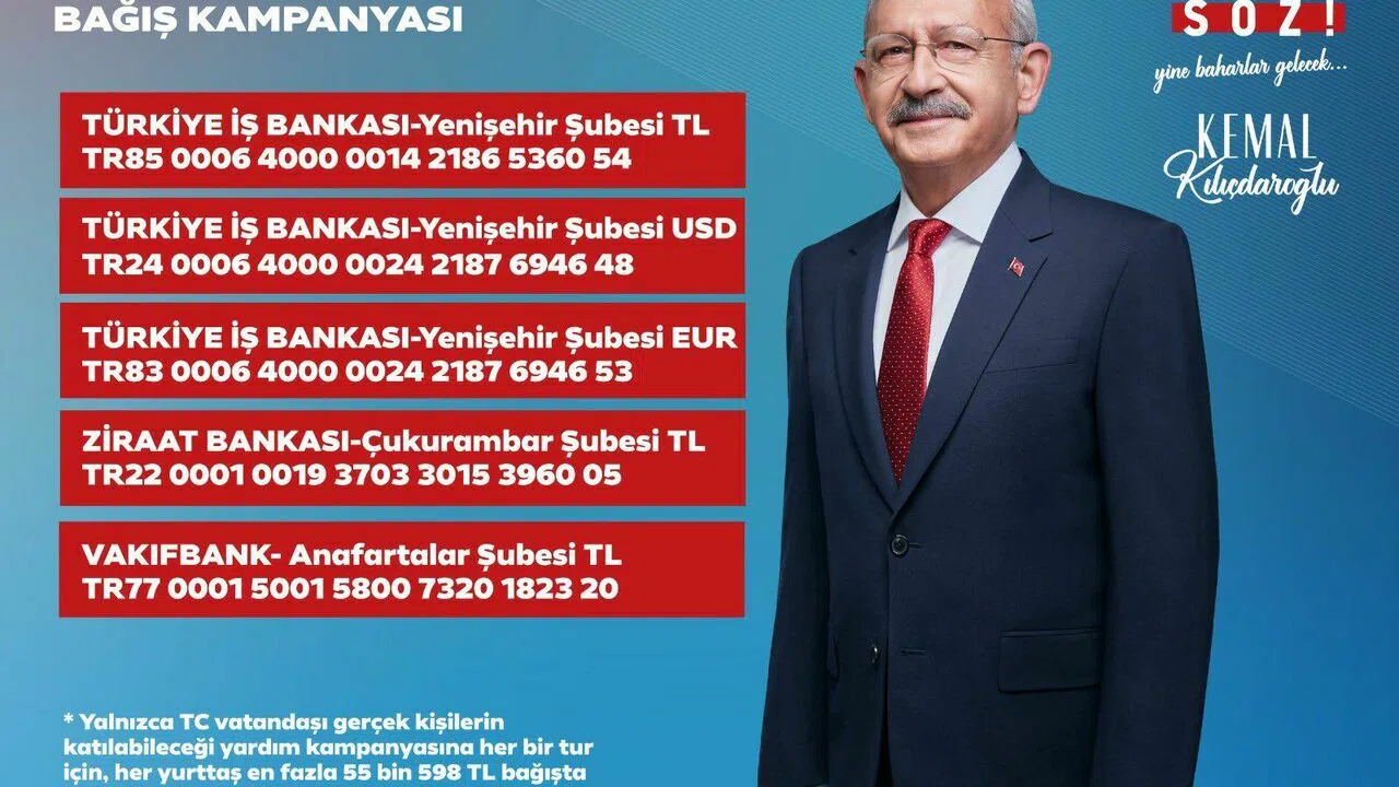 CHP Antalya İl Başkanı Nuri Cengiz, sosyal medya hesabından, “Milletin Cumhurbaşkanı Sayın Kemal Kılıçdaroğlu'na katkı sunmak için bağış kampanyamız başlamıştır. 14 Mayıs’taki cumhurbaşkanlığı seçimleri için sarayın günden güne artan bütçesine karşı dayanışmamızı güçlendirmek isteyen yurttaşlarımızın desteklerini bekliyoruz!” diye konuştu.