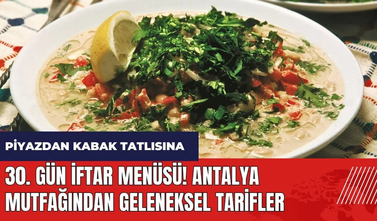2024 Ramazan ayının son gününe geldik. Ramazan Bayramı arefesinde iftar için ne yapacağınızı bilemiyorsanız, 30. gün iftar menüsünde Antalya yöresinden lezzetler var. Kültür Portalı'ndan Antalya yöresine ait Sütlü Buğday Çorbası, Yörük Kebabı, Antalya Piyazı ve Antalya Usulü Kabak Tatlısı tariflerini aşağıda bulabilirsiniz.