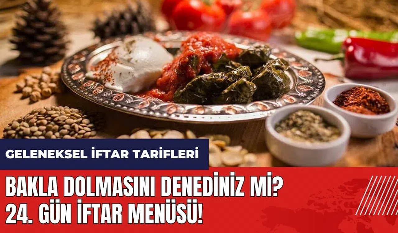 Ramazan ayında iftar menüsü vatandaşların en çok araştırdığı konulardan biri. Geleneksel tatlardan oluşan 24. gün iftar menüsü için önerilerimiz; Ayranlı Çorba, Amasya Bakla Dolması, İnegöl Köftesi ve Cevizli Kırma Tatlısı. Kültür Portalı'ndan Ayranlı Çorba, Amasya Bakla Dolması, İnegöl Köftesi, Cevizli Kırma Tatlısı tariflerini ve pif noktalarını aşağıda bulabilirsiniz.