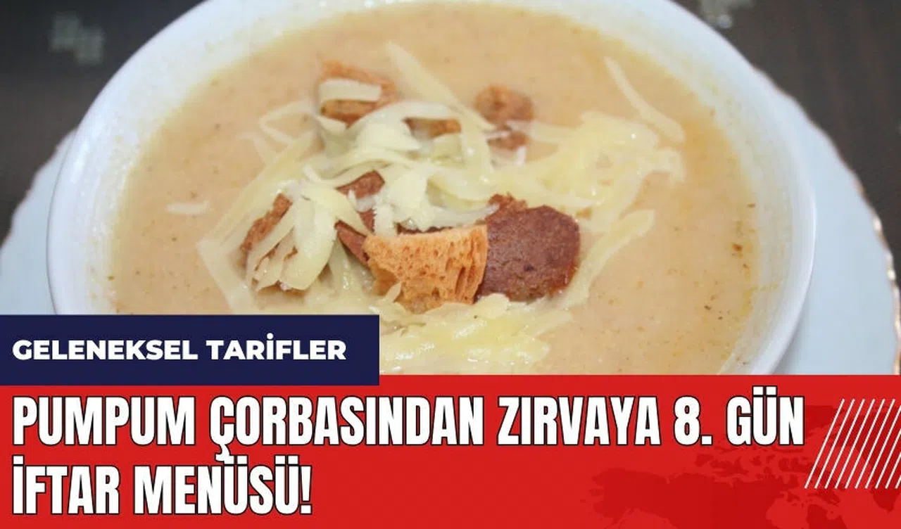Ramazan ayında iftar menüsü vatandaşların en çok araştırma yaptığı konulardan biri. Ramazan ayının 8. gün iftar menüsünü geleneksel tariflerle dolduruyoruz. Kültür Portalı'ndaki geleneksel tariflerden Pumpum Çorbası, İlibada Dolması, Dik Dik Kebabı ve Zırva bulunuyor.