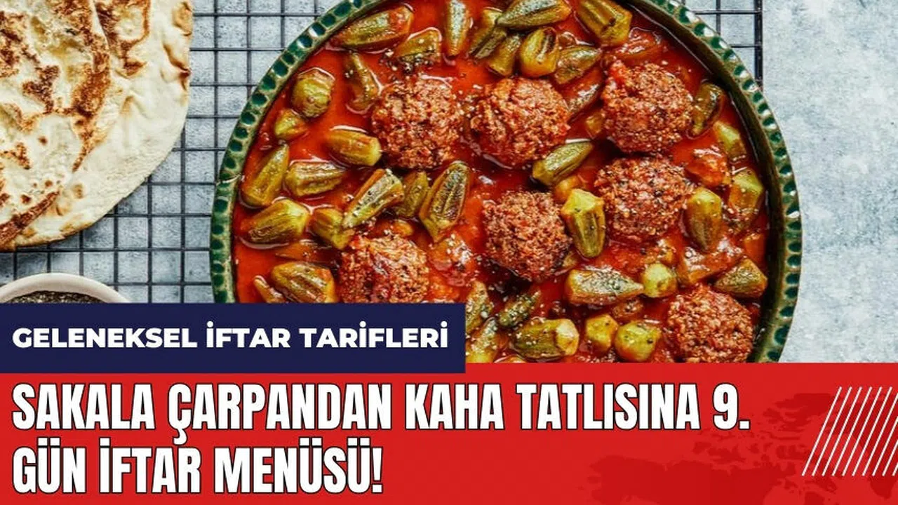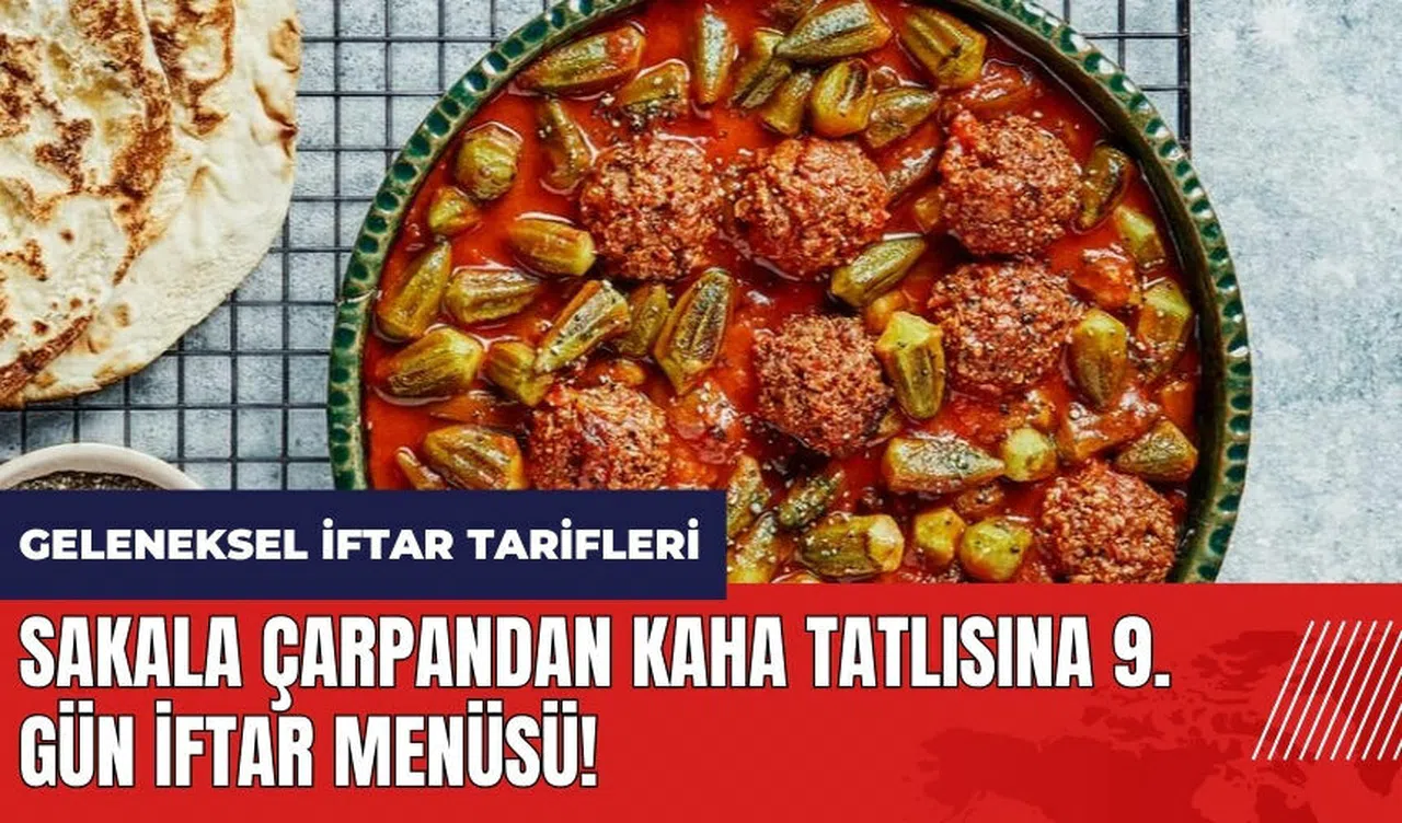 Ramazan ayında iftar menüsü vatandaşların en çok öneri araştırdığı konulardan biri. Ramazan ayının 9. gün iftar menüsü için tavsiyemiz Sakala Çarpan Çorbası, Etli Bamya, Amasra Salatası ve Kaha Tatlısı'ndan oluşuyor. Kültür Portalı'ndan Sakala Çarpan Çorbası, Etli Bamya, Amasra Salatası ve Kaha Tatlısı tarifleri aşağıda....