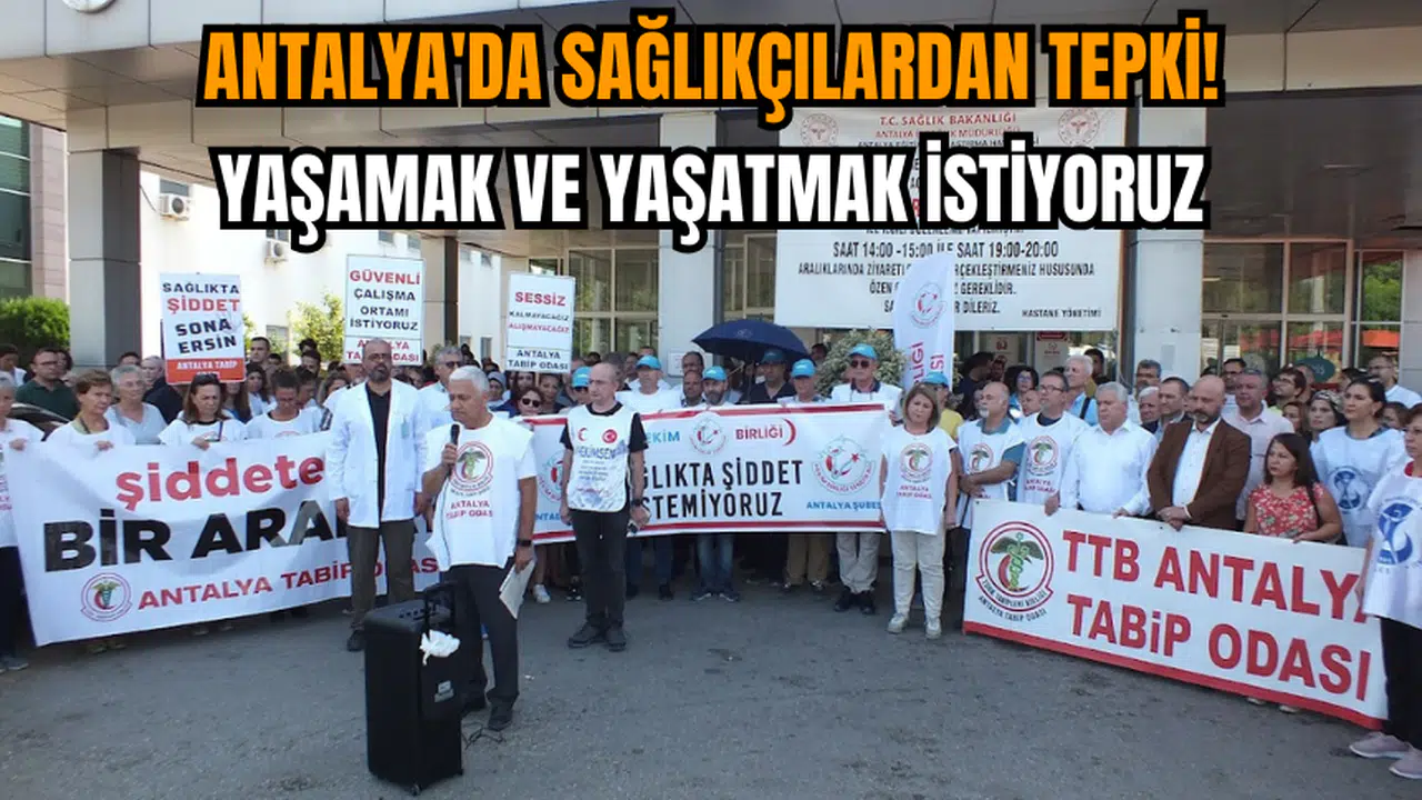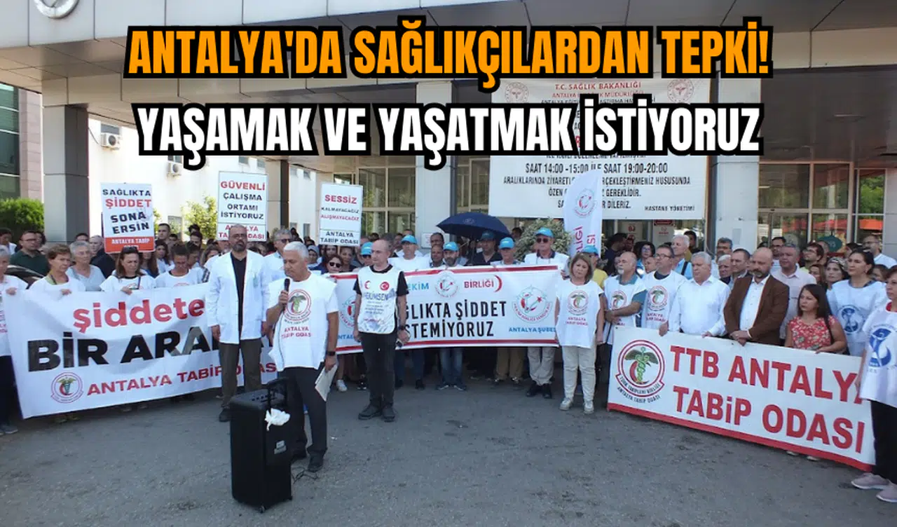 Antalya Tabip Odası (ATO) öncülüğünde yapılan eyleme, Hekim Birliği Antalya Şubesi, Sağlık ve Sosyal Hizmet Emekçileri Antalya Şubesi ve Hekim-Sen verdi. Sendikalar adına basın açıklamasını okuyan Antalya Tabip Odası Başkanı Prof. Dr. Taha Karaman, “Sağlıktaki şiddet olayının sorumlusu sağlık sistemidir. Sağlık hizmetini ticaret metaı olarak gören zihniyetin eseridir. Sağlık hizmeti deyince tüm sağlık sistemini düşünüyoruz. Sadece hasta tedavisi müşteri ilişkisi değil kamusal sağlık hizmetlerinden uzaklaştırılarak konu sadece hasta muayene etmeye indirgenemez. Bir kez daha vurgulamak isteriz ki; 3-5 dakikaya sığdırılmaya çalışılan muayenelerle verilemeyen sağlık hizmeti, yok sayılan sağlık hakkı, iyileşemeyen hastalıklar, bulunamayan ilaçlar, yapılamayan ameliyatlar, mesleki özerkliğe yönelik müdahaleler, hekimlerin/sağlık emekçilerinin tükenmişliği ve son zamanlarda iyice derinleşen ekonomik zorluklar, toplumun sağlığını bozdu” dedi.