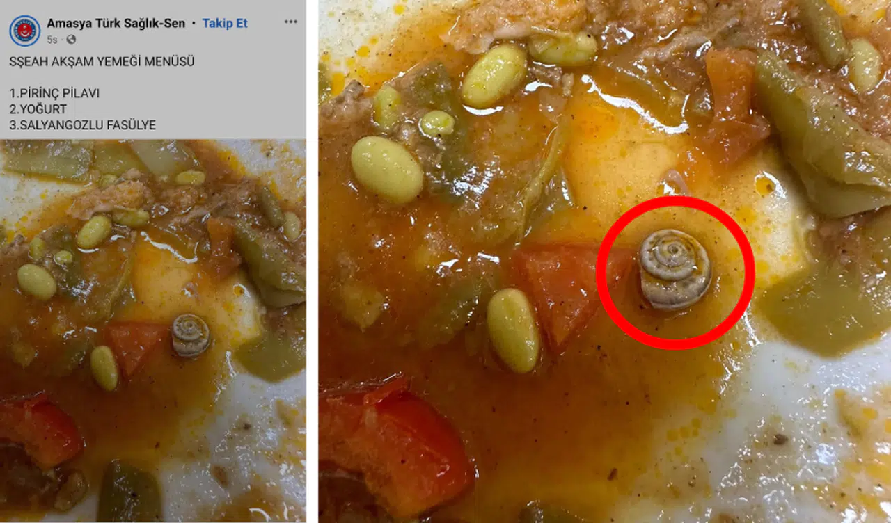 Dün akşam hastane personeli ve hastalara sunulan menüde yer alan fasulye yemeğinde salyangoz bulunduğunu ileri süren bir çalışan, konuya dair çektiği fotoğrafı Türk Sağlık-Sen Amasya Şubesi yöneticilerine iletti. Yapılan şikayet üzerine sendika, yemeğin çekilen fotoğrafını sosyal medya hesabından paylaştı.