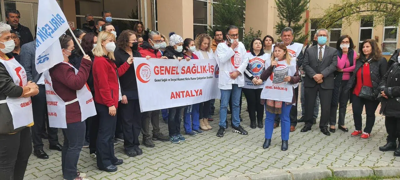 Genel Sağlık-İş Antalya İl Temsilcisi Nur Hamide Cirit, “Bizler, sağlıkta şiddetin gölgesinde, kötü çalışma koşullarında, açlık sınırında maaşlarla nitelikli sağlık hizmeti sunmak için mücadele vermekteyiz. Bizler; sözleşmeli çalışma modelleri ile tayin haklarımızın bile engellendiği bir ortamda halk sağlığını önceleyerek kendi sağlığımızdan vazgeçerek hizmet üretmekteyiz. Bizler; pandemide maskesiz, bonesiz, kişisel koruyucu ekipmansız çalışmak zorunda bıraktığınız, balkonlarda alkışlayarak hakkınız ödenmez deyip hakkını ödemediğiniz sağlık emekçileriyiz. Bizler: yılda 38 TL giyim yardımı alırken, her nöbet tutumu içinde iki takım forma değiştirmek zorunda kalan sağlık emekçileriyiz. Bizler; koruyucu sağlık hizmeti olan aşılarımızı köy köy, hane hane tüm yurttaşlarımıza ulaştırmak için ülkemizin her köşesine hizmet götüren doktorlar, ebeler, hemşireleriz. Bizler; 39 farklı meslekten nitelikli, ücretsiz, bilimsel ve erişilebilir sağlık hizmeti üretmek için emek veren sağlık profesyonelleriyiz. Bizler, yoksulluk sınırı altında hak ettiğini alamayan Kamuda Çalışan Mühendisleriz. Sağlık çalışanlarının çözüm bekleyen sorunları dağları aşarken: aylık 150 TL tutarında bir ödemenin gündem olması sağlık çalışanlarına yapılan en büyük haksızlıktır. Bizler, siyasal erkin, yapabilme gücünü sendikal örgütlenme özgürlüğünün önüne baraj koymak için değil, sağlık çalışanlarının sorunlarının çözümünde görmeyi isteriz. Sağlıkta şiddet ile etkin mücadele edin” diyerek AKP iktidarına yüklendi.