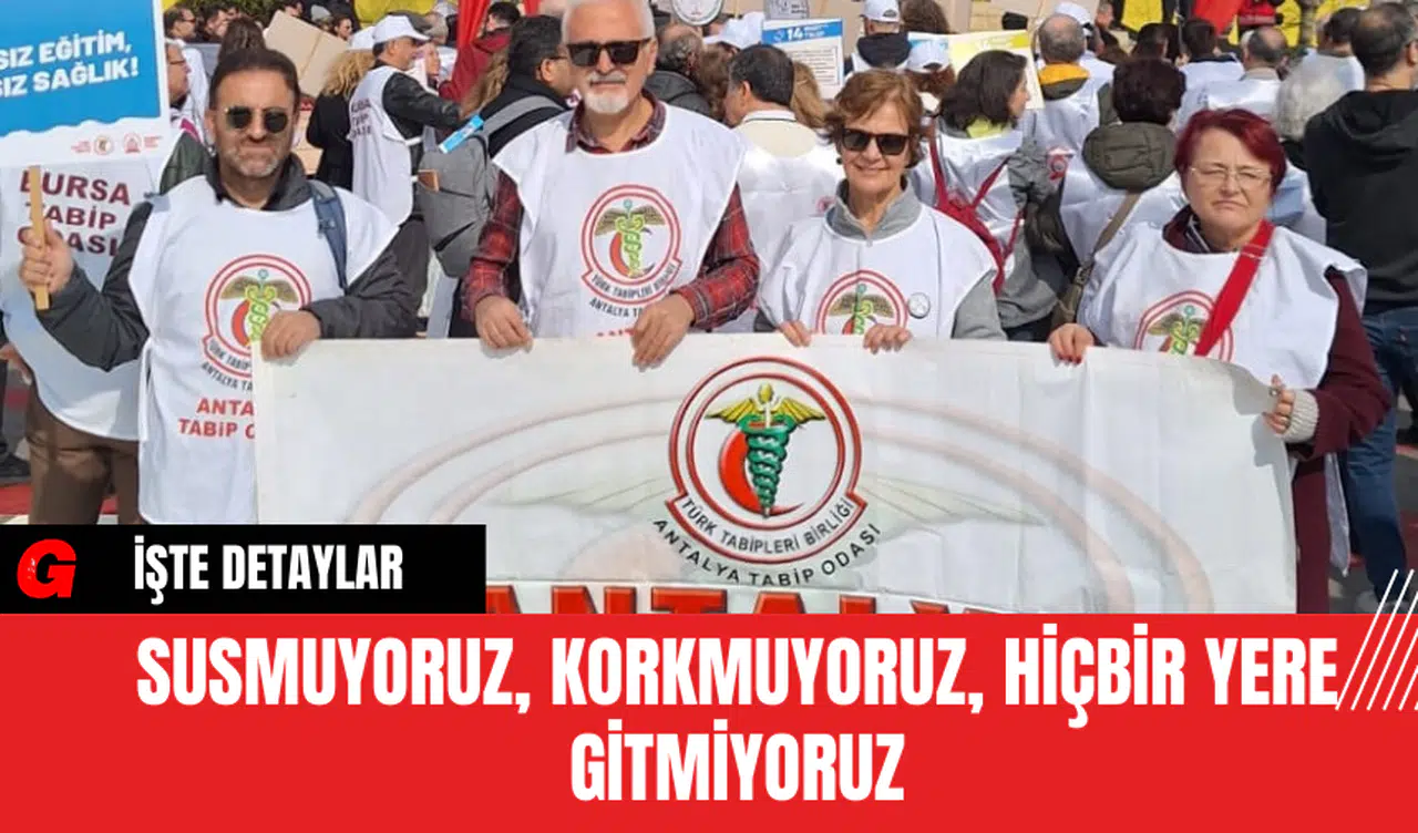 Açıklama, “Laik, demokratik Cumhuriyet ve barış için ‘Susmuyoruz, korkmuyoruz, Hiçbir Yere gitmiyoruz!!!’ sloganıyla sonlandı.” ifadeleriyle son buldu. Antalya Tabip Odası, bu açıklamayla hekimlerin ve sağlık emekçilerinin sorunlarını ve taleplerini bir kez daha gündeme getirdi.