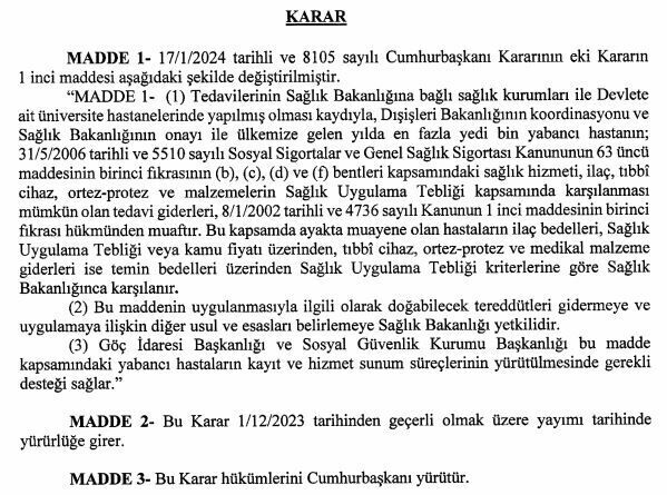 Yabancı hastalar için Türkiye'de ücretsiz sağlık hizmetlerinden faydalanma kapsamı genişliyor. Resmi Gazete'de yayınlanan yeni karara göre, artık yılda en fazla 7 bin yabancı hasta, devlet hastanelerinde ücretsiz sağlık hizmetlerinden yararlanabilecek.