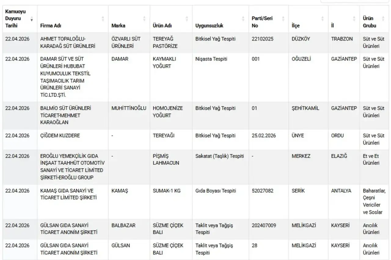 22 Nisan 2026 tarihinde güncellenen Taklit veya Tağşiş Yapılan Gıdalar (Aynı Değeri Taşımayan Madde Eklenmesi) listesinde Antalya'dan da bir ürün yer aldı.
