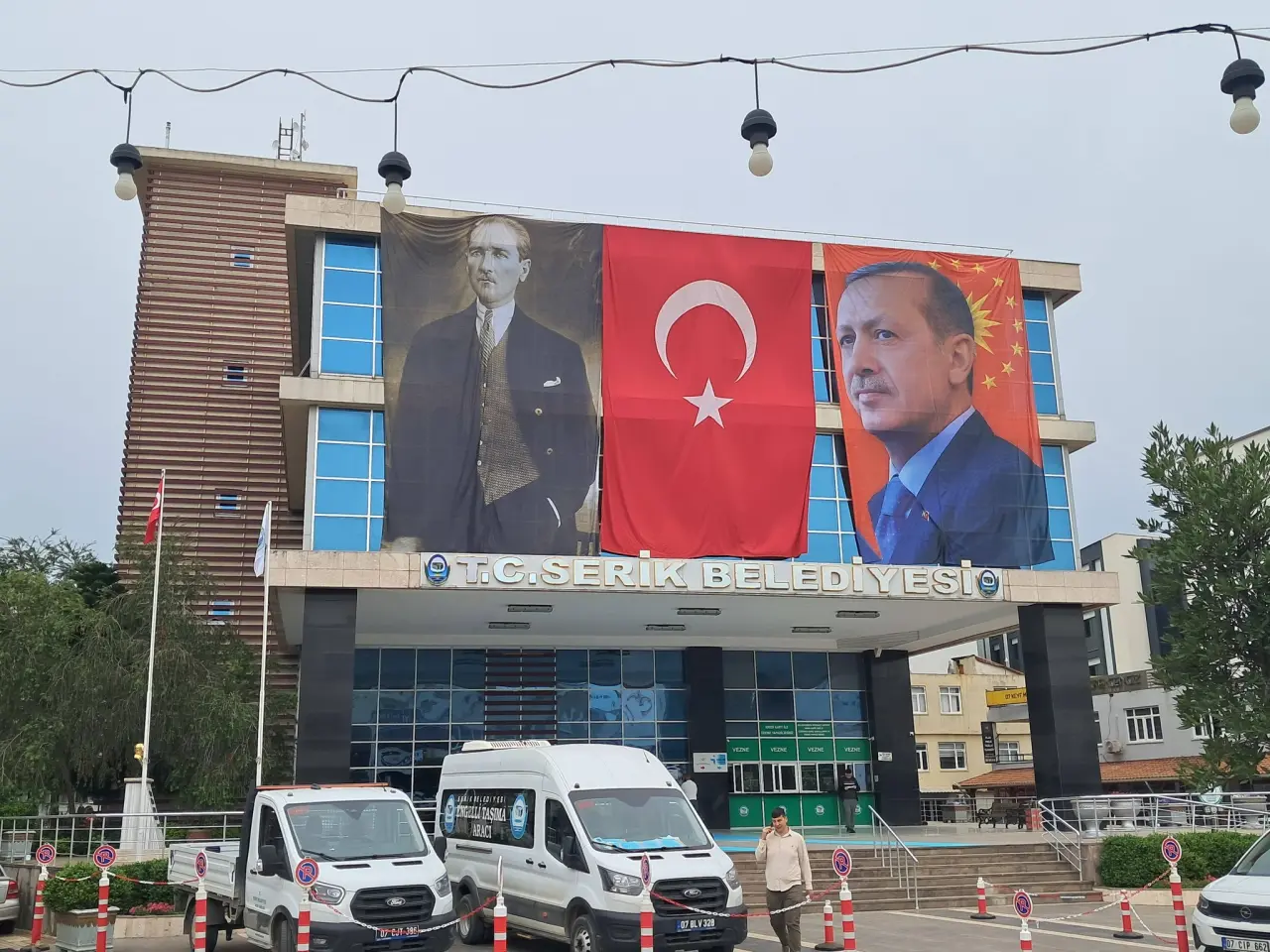 Cumhurbaşkanı’nın ziyaret edeceği açıklanan Serik Belediyesi’nde büyük bir hareketlilik yaşandı. Serik Belediye binası Atatürk, Türk Bayrağı ve Cumhurbaşkanı Erdoğan posteri ile donatılırken bina girişine turkuaz rengi halılar da serildi.