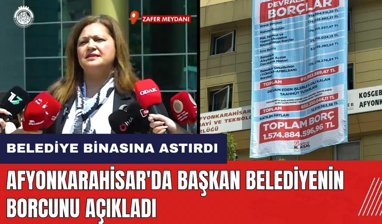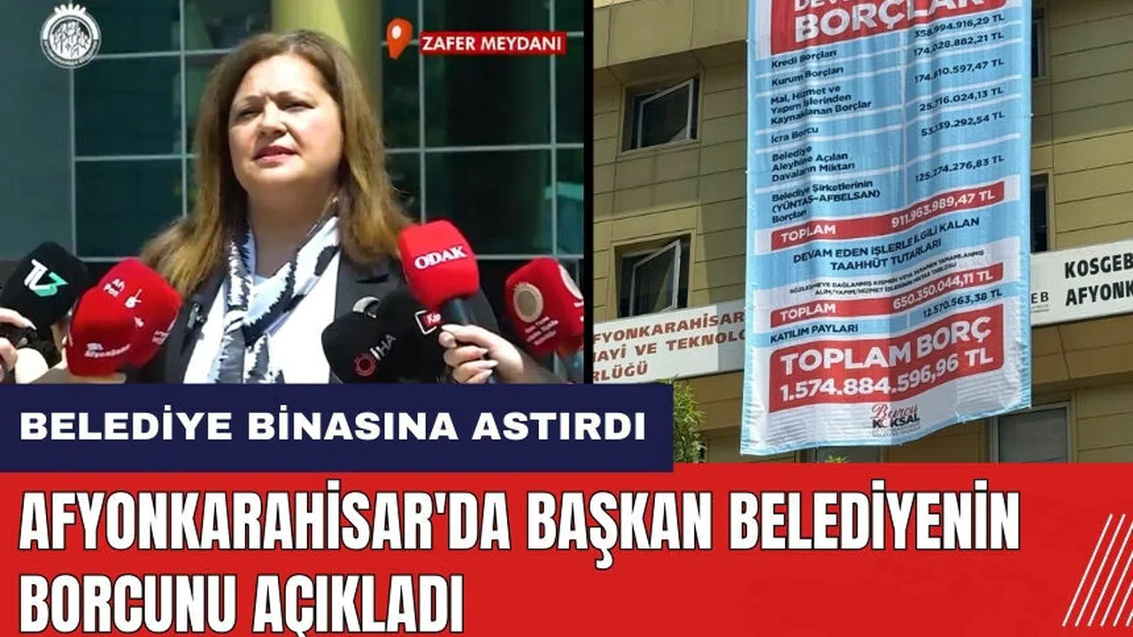 Belediye başkanlığı görevini devralan Köksal, belediyenin mali durumunu açıkladı ve şehre olan borçlarını detaylı bir şekilde paylaştı. Afyonkarahisar Belediye Başkanı Burcu Köksal, yapılan açıklamada, belediyenin güncel borcunun 1 Milyar 574 Milyon 884 Bin 596 TL olduğunu belirtti. Köksal, 'Yerel seçimler sürecinde şeffaf bir yönetim anlayışı sergileyeceğimizin sözünü vermiştik. Belediyemizin mali durumu ile ilgili olarak yönetimi teslim aldığımız gün itibarıyla mevcut borç tablomuzu, gerek binamızın dışına; gerek billboardlara; gerekse şehrimiz muhtelif bölgelerine asarak şehrimize ilan ediyoruz.' dedi.
