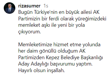 AKP Antalya eski İl Başkanı Rıza Sümer, Kepez’e aday olacağını açıkladı. Adaylık açıklamasını sosyal medyadan duyurdu.